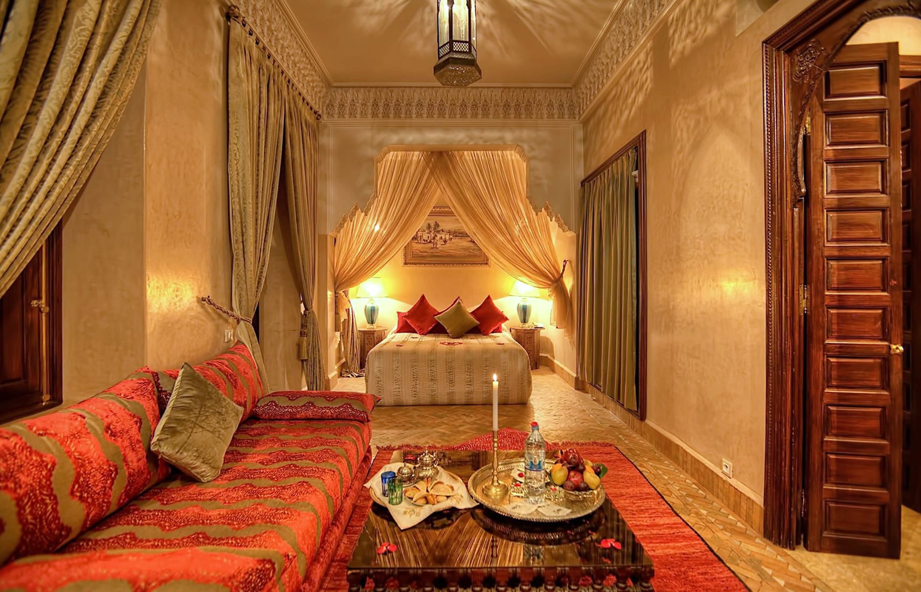 Tall wooden doors open onto luxurious suites from the delightful courtyards. Each suite is individually decorated with lush fabrics of ruby satins and creamy silver velvets, inlaid mirrors, and hand-painted tables.