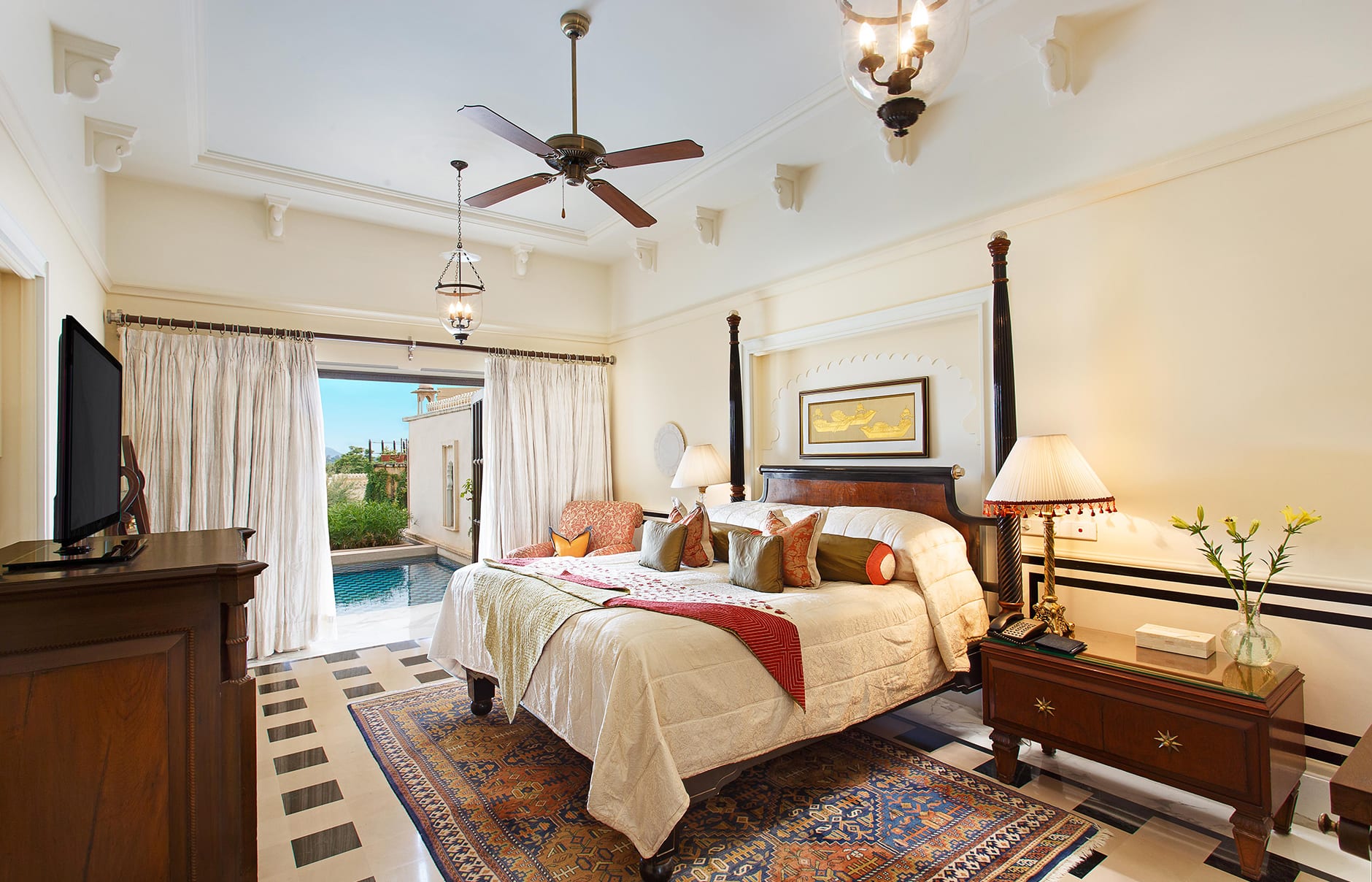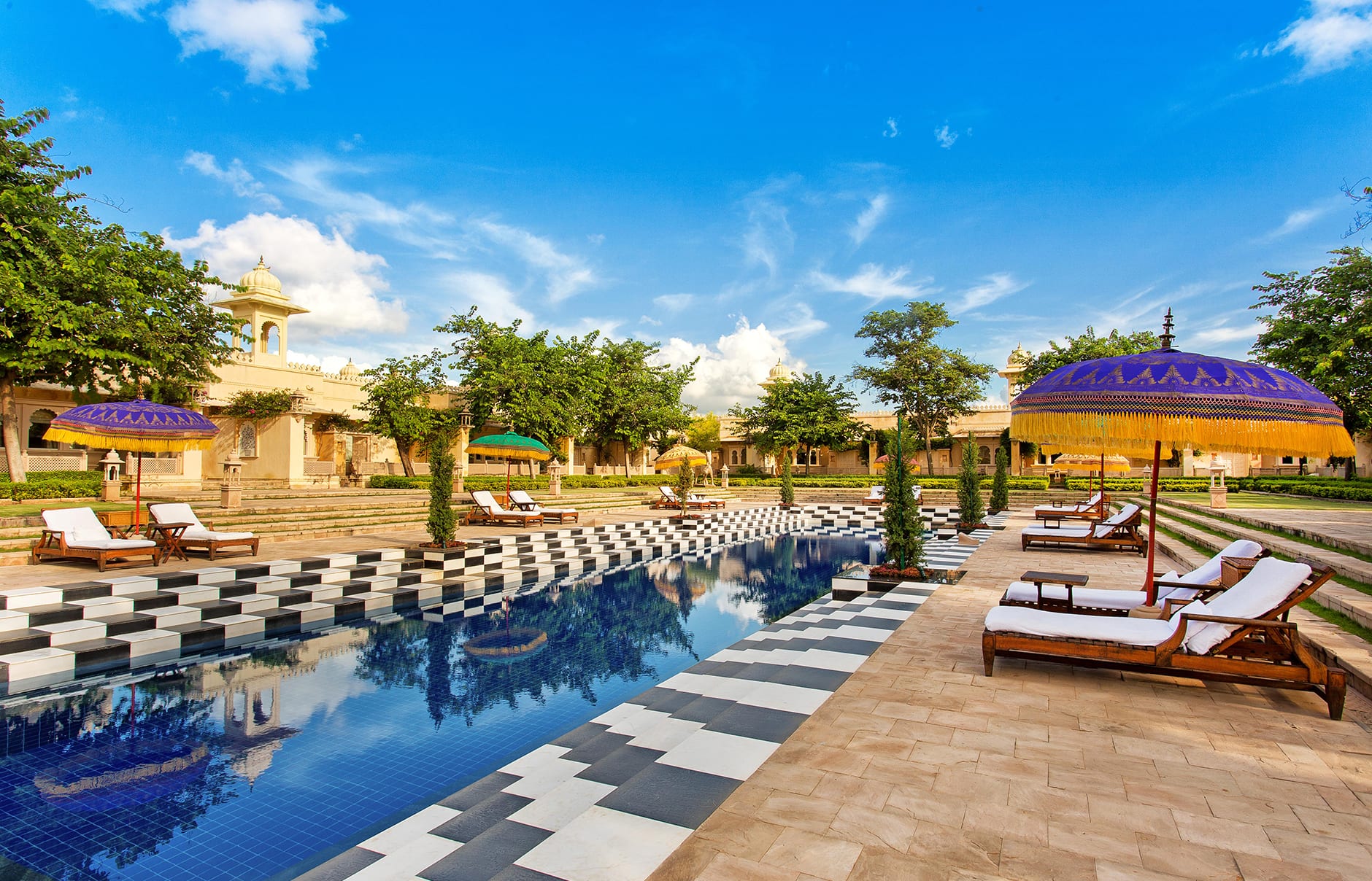 Surrounding the hotel are acres of immaculate gardens, peppered with centuries-old banyan trees. Peacocks, squirrels, and birds roam garden lawns. Udaivilas feels embedded in the lakeside landscape.