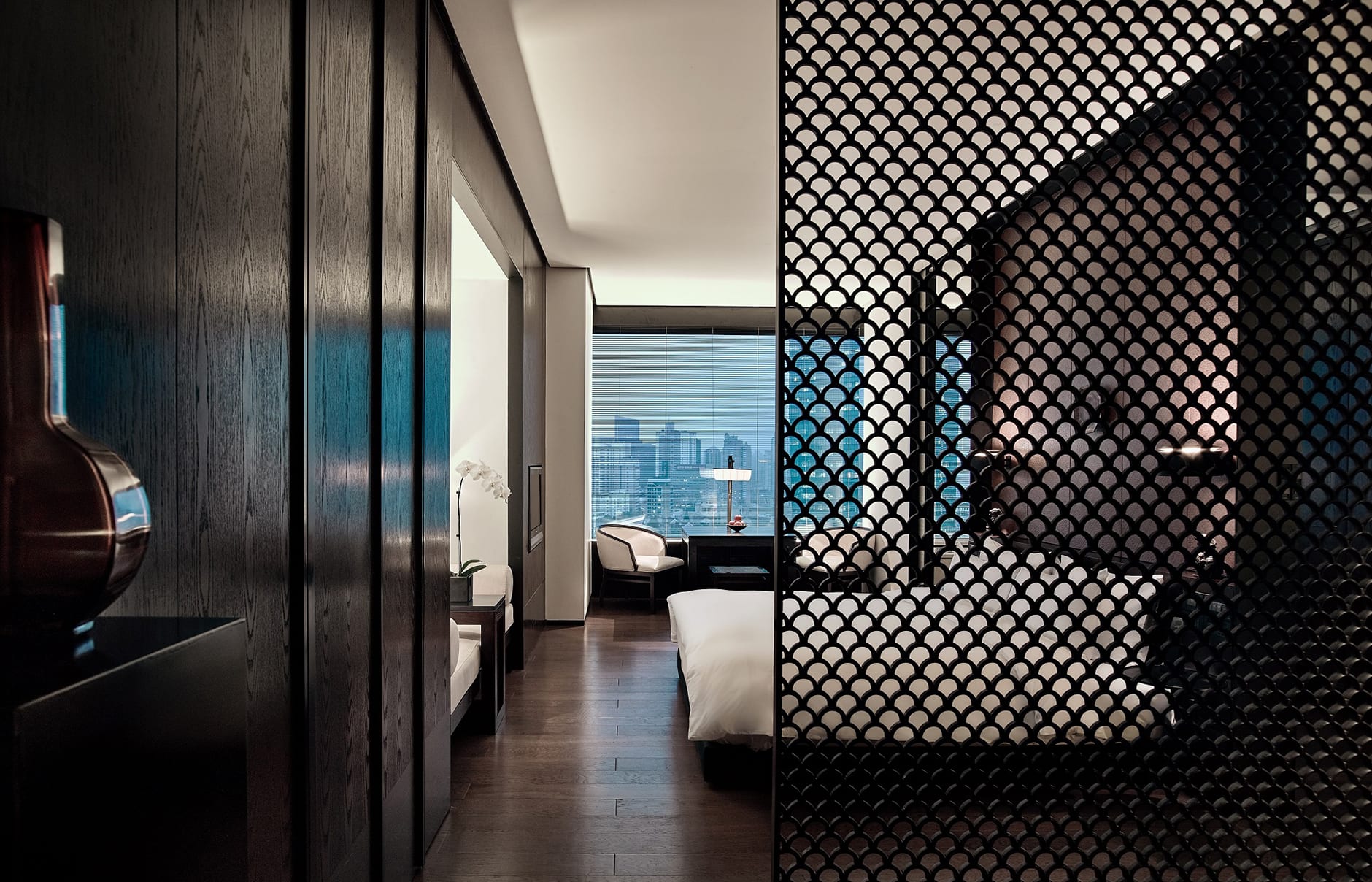 The guest rooms are spacious retreats where work and play are equally important. The spaces flow freely, also into the generous bathroom, separated only by oversized sliding screen doors with translucent silk sandwiched between glass panels.