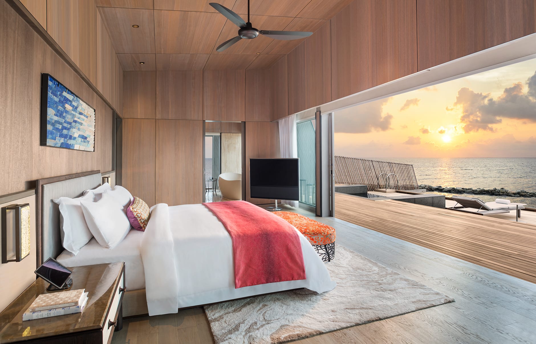 The decor really does feel “St Regis” though — it is neat and crisp, set in palettes of creme and light wood and infused with natural light. The open plan makes the interior naturally flow into the indulgent outdoor terrace featuring a private plunge pool, loungers, and over-water nets. Accessible directly from the bedroom or bathroom through the sliding floor-to-ceiling windows, the deck also allows for descent directly to the sea.
