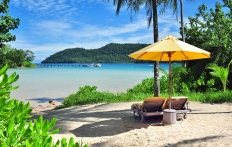 The resort's beach is fantastic. It has a large swath of white sand, flanked by a forest of tall palms.