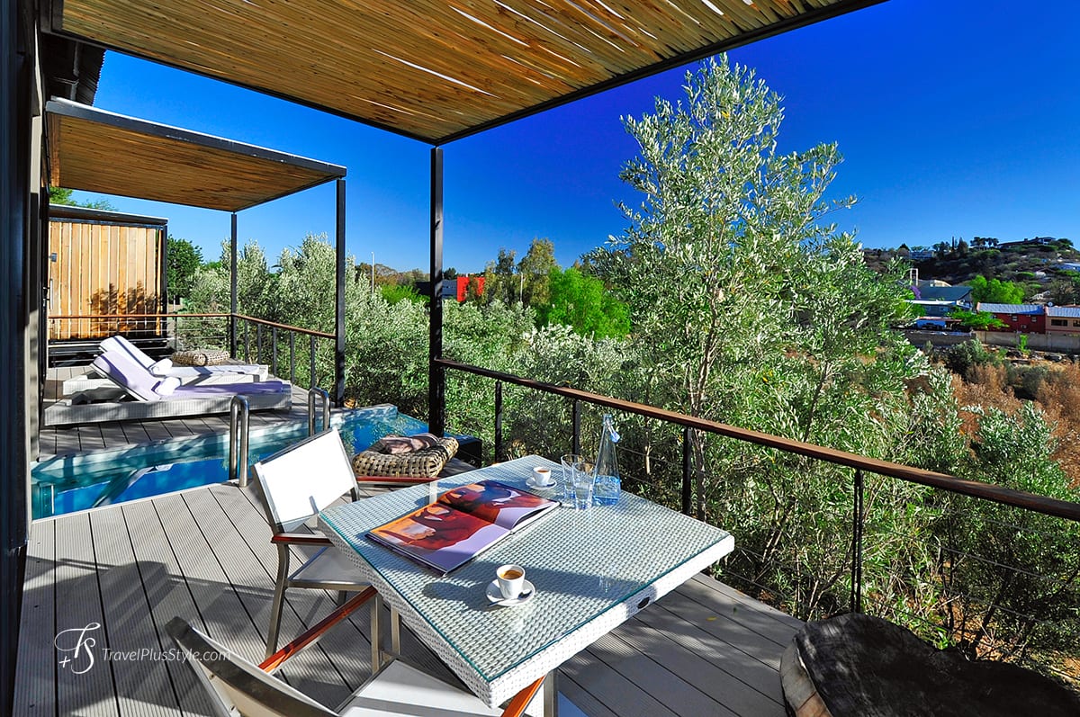 Our room's glass wall opens onto a spacious terrace with a view over the hotel's well-kept greenery and the suburban hills of Windhoek.