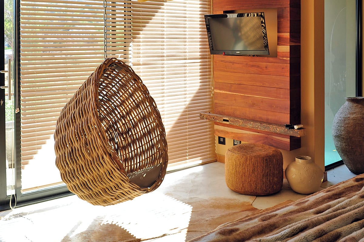 Central to each room are fantastic weaved furnishings: roughly-hewn rattan lampshades, rush baskets and enormous spherical hanging chairs suspended from the ceiling.