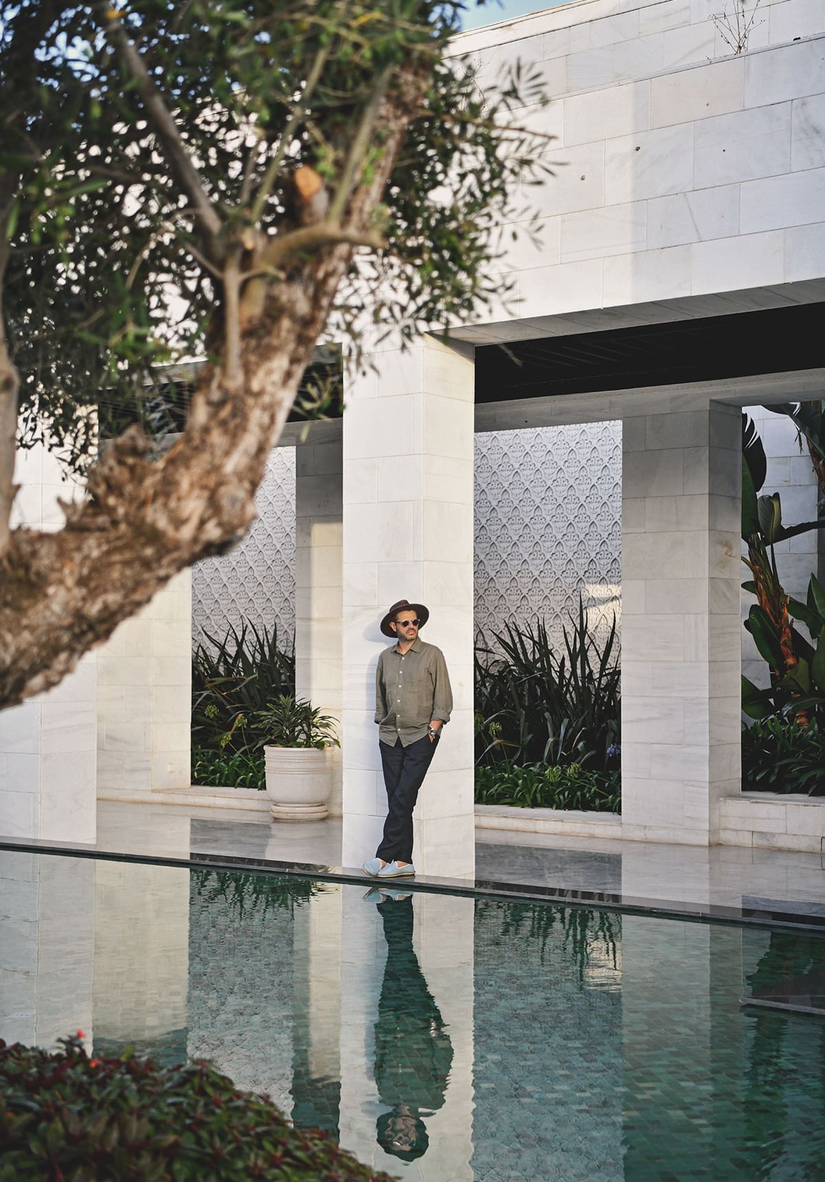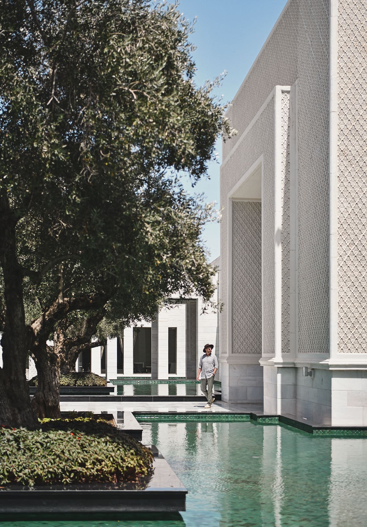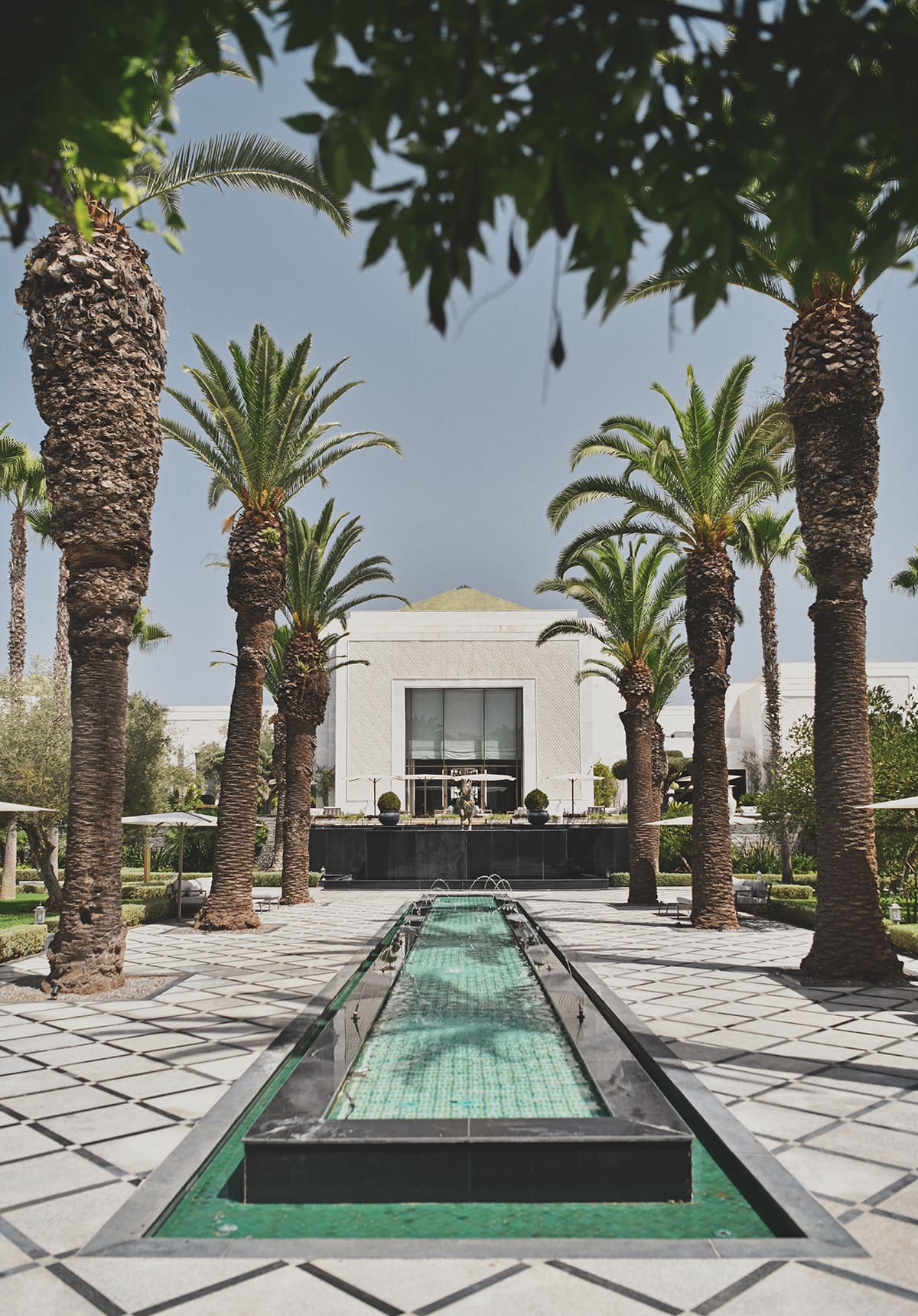 Entering from the driveway to the Ritz-Carlton Rabat hotel felt like stepping into an art installation. Picture a pathway leading through an olive grove planted in a shallow reflecting pool. The white stone, still water, and greenery combine to set the stage for a unique experience.