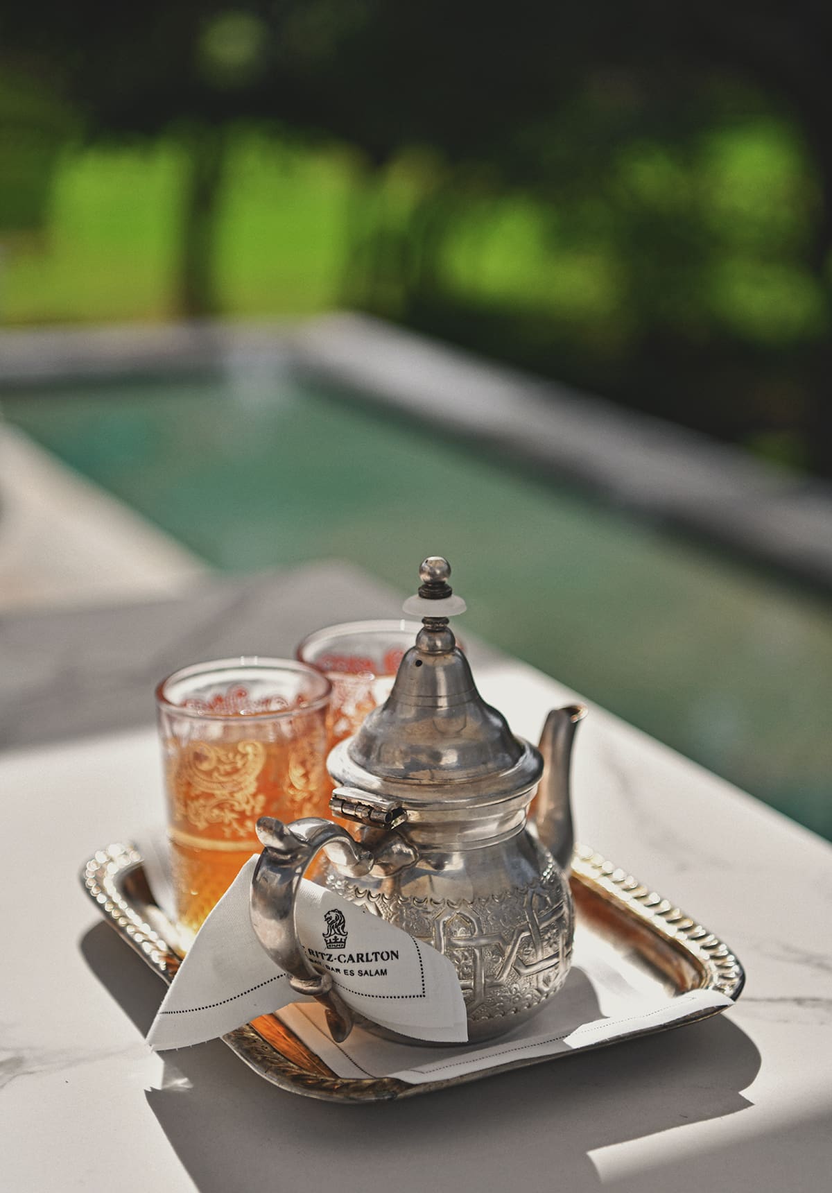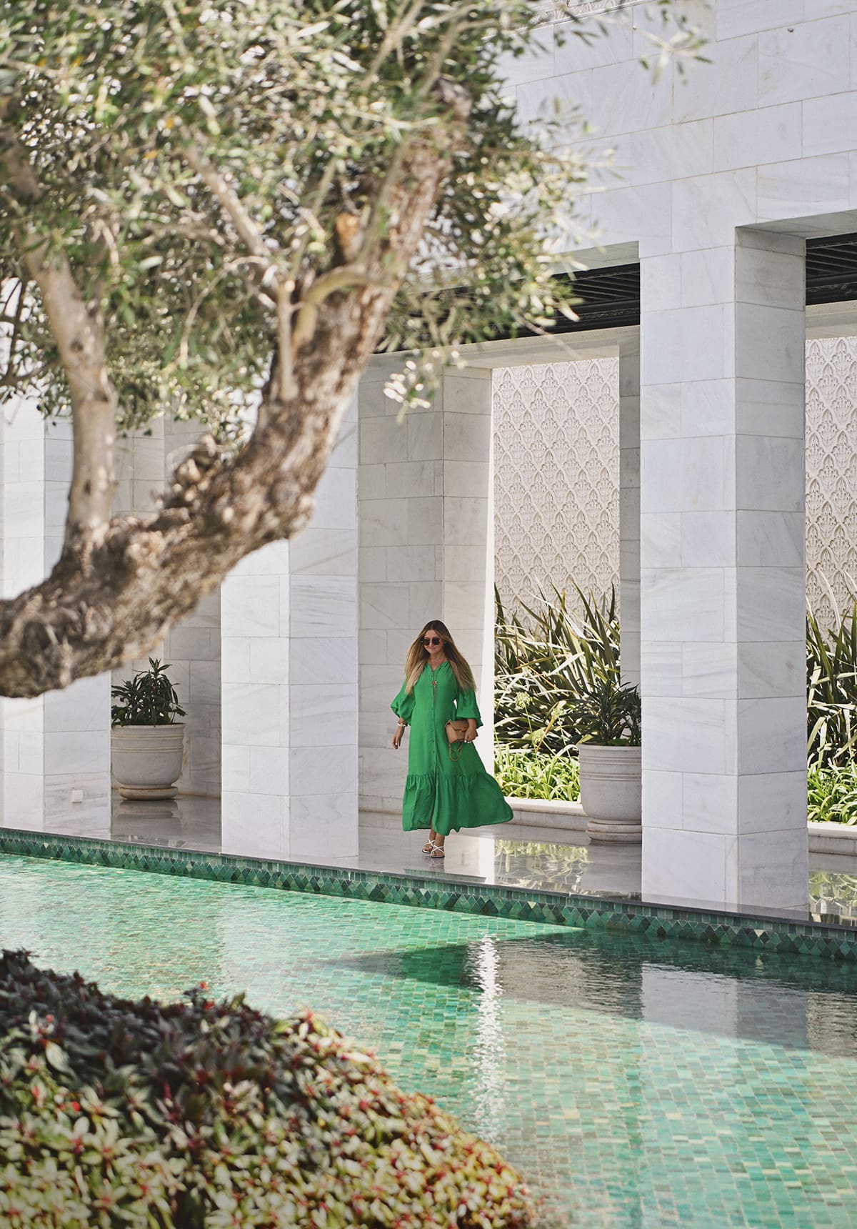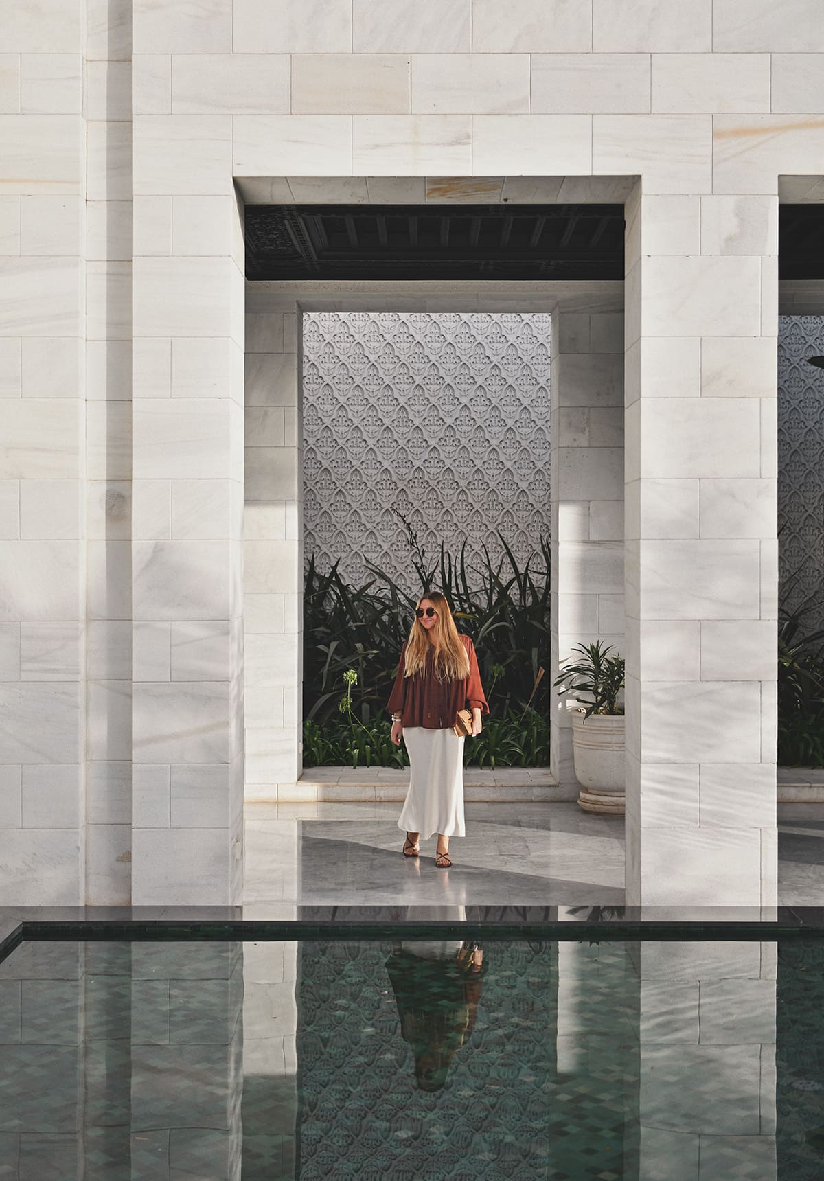 Entering from the driveway to the Ritz-Carlton Rabat hotel felt like stepping into an art installation. Picture a pathway leading through an olive grove planted in a shallow reflecting pool. The white stone, still water, and greenery combine to set the stage for a unique experience.