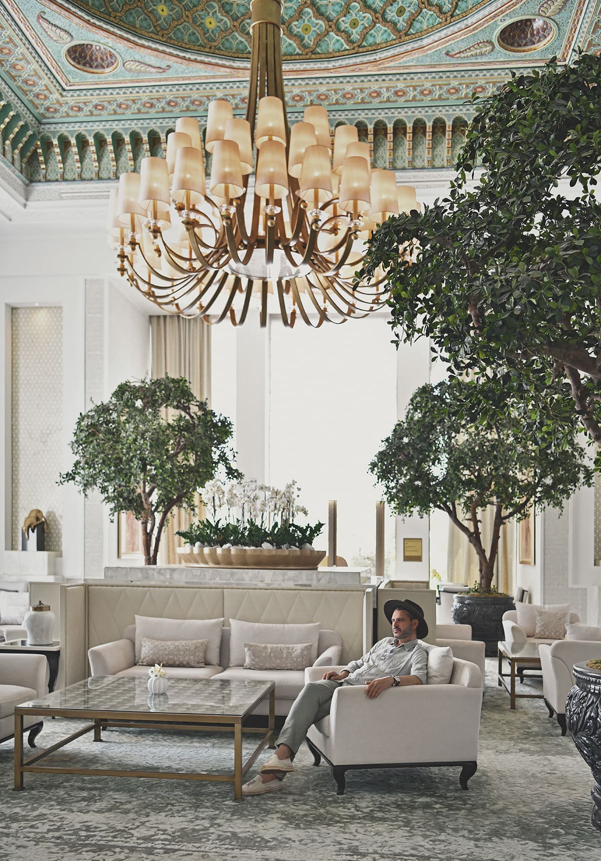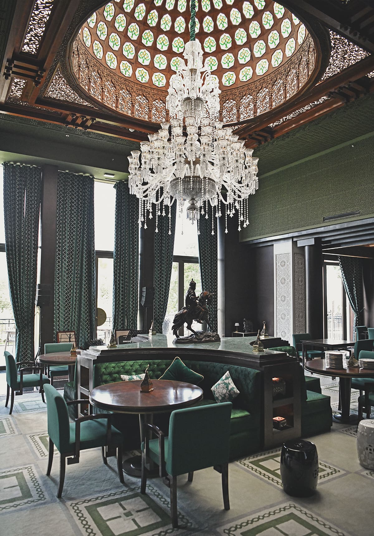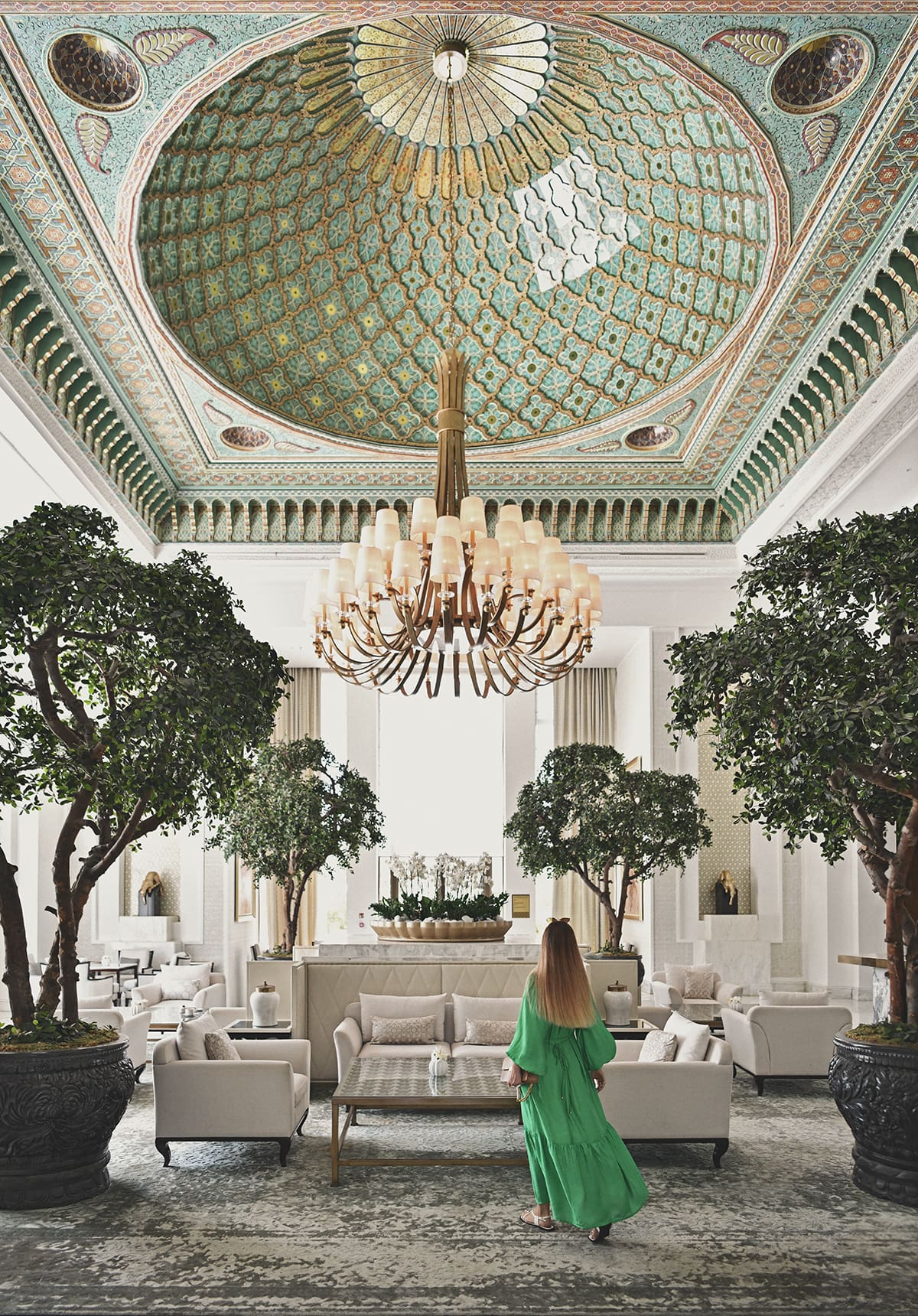 Once we stepped into the soaring lobby, the first impression was one of classic Moroccan grandeur, defined by high muqarnas ceilings and intricate zellij tilework, with numerous panther sculptures and framed pictures of Ottoman-era hunting scenes adding a touch of decadence.