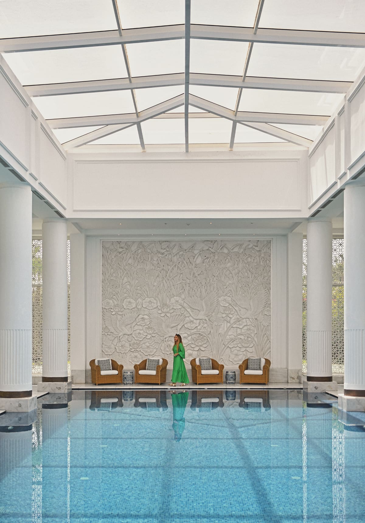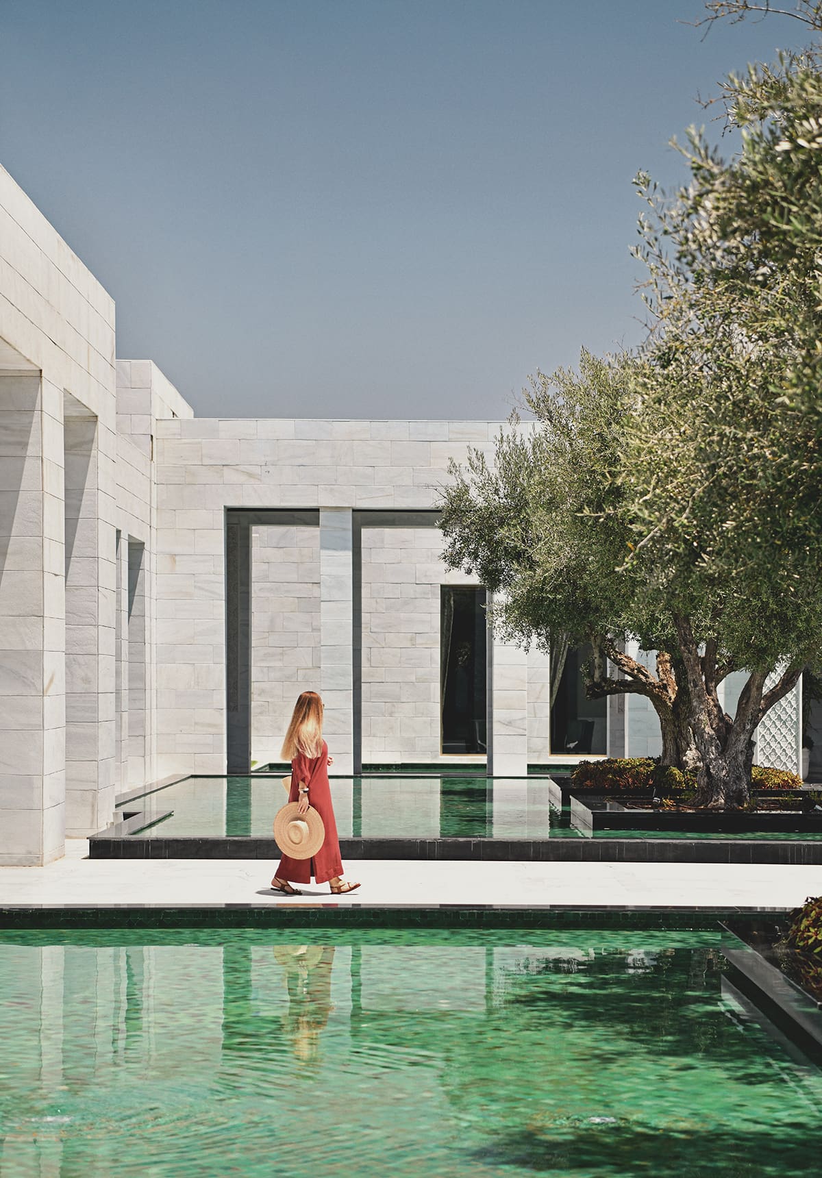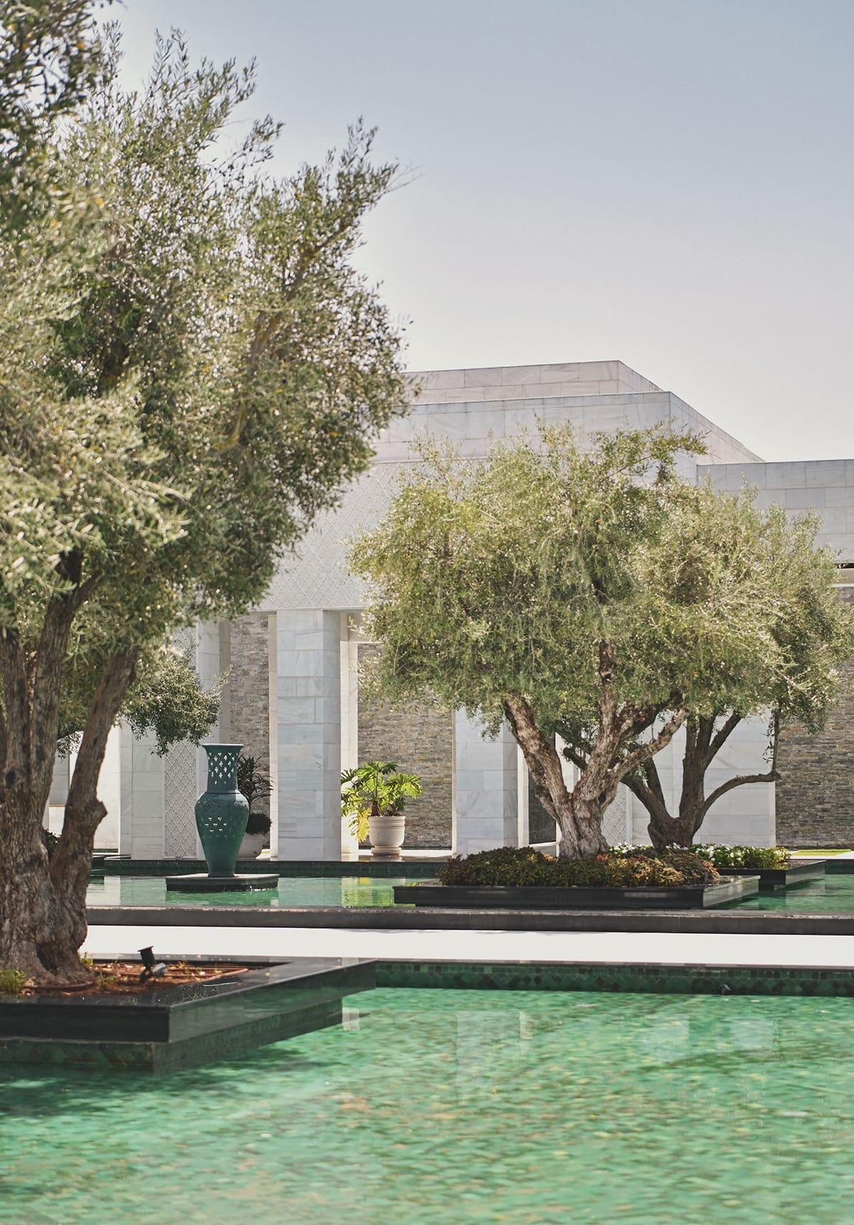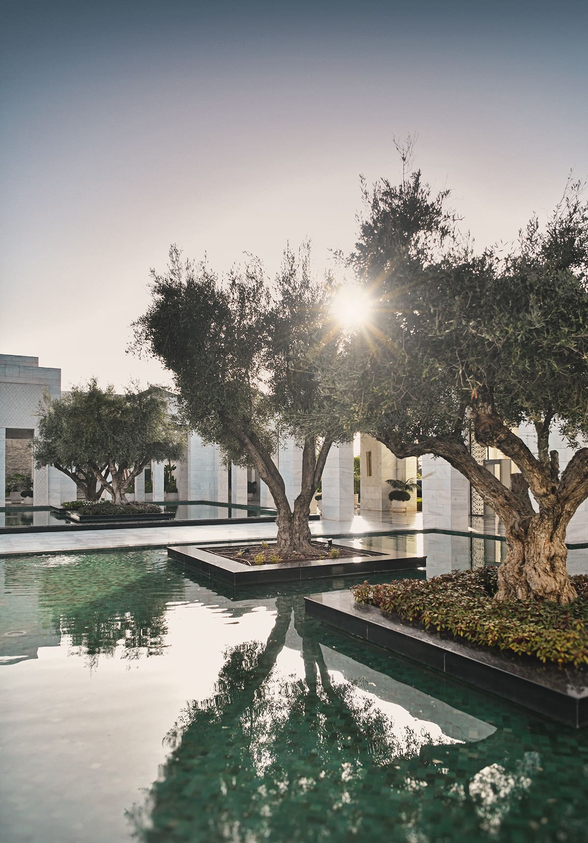 The entrance itself is unforgettable. A pathway leads you past a shallow reflective pond filled with olive trees, then onward into the grand lobby. Even without a treatment, just that approach puts you in the right state of mind.