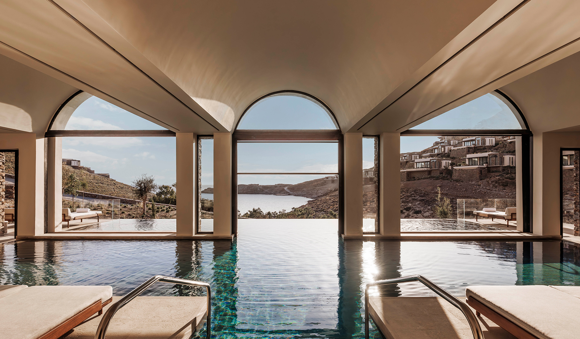 Infusing Cycladic opulence with a commitment to sustainability, Kiros Pagkalidis Architects employed local materials like volcanic stone and light oak, resulting in a neutral palette accented with dark elements and seamlessly blending indoor and outdoor spaces. To enrich the boutique’s holistic ambiance, Domes’ SOMA Spa features an indoor pool and gym, along with the Greek concept of ‘Ef Zeen’ living, synonymous with ‘the art of living well.