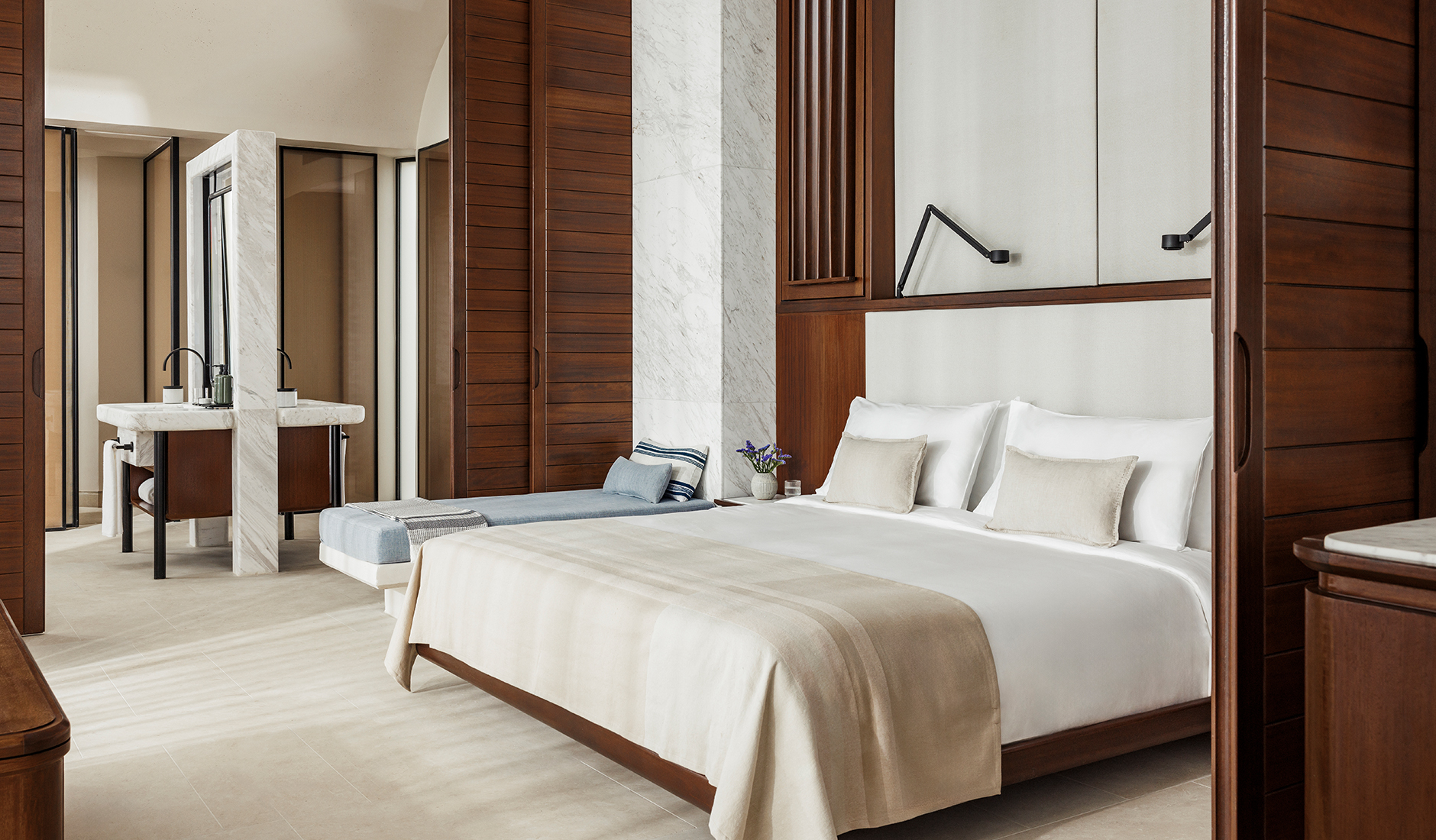 One&Only Aesthesis stands in a twenty-one-hectare estate on a 1600-meter stretch of a beachfront in Southern Athens. It occupies a refurbished property constructed in the mid-1950s in the heart of the Athenian Riviera, where “lavender lands meet sapphire waters.” The resort experience is synonymous with sleek luxury and a soothing atmosphere, including in the nostalgic beach club. In no small part this is thanks to its design, dominated by natural stone, timber, and calming colors. The rooms, suites, and villas are inspired by ancient mythology mixed with the glamour of the Aegean vacations, but they also pay homage to mid-century design. Dining offers a range of distinct flavors, and the Chenot Spa tailors treatments to individual guests.