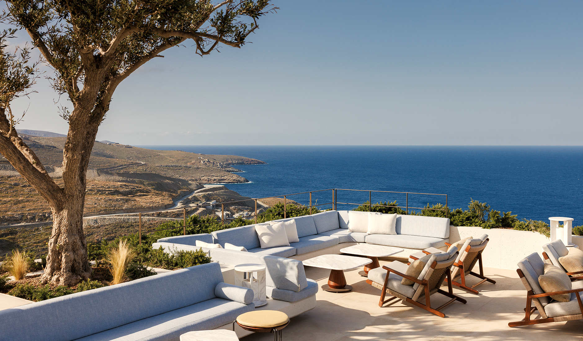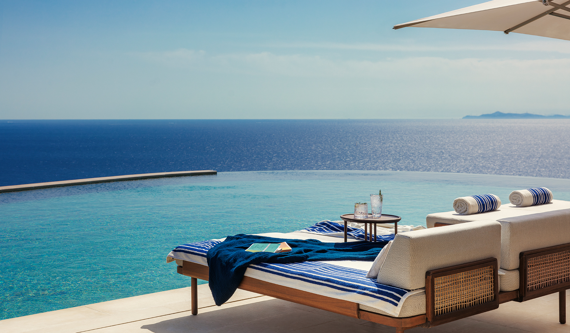 A tribute to Greek elegance, this boutique hotel offers sweeping views of Mykonos Town and the Aegean Sea. Designed by Athens-based Studio Bonarchi, the 42 rooms and suites—many with private pools—blend traditional elements with avant-garde design, featuring natural stone, pine wood, linen, and rattan, all set against the blue backdrop of the Aegean Sea. Custom artwork by Richard Serra, Thomas Houseago, and Philippe Antonioz further enhances the ambiance. Anandes’ stunning poolside and al fresco dining space offers unparalleled island views. The French Riviera-inspired restaurant, La Petite Maison, occupies the open-air poolside area, seamlessly aligning with the Anandes ethos and paying homage to the timeless charm of Mykonos with subtle references to Greek mythology.