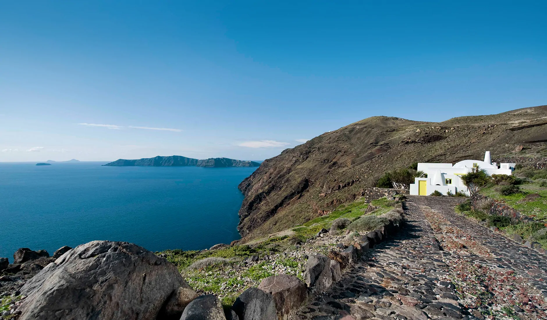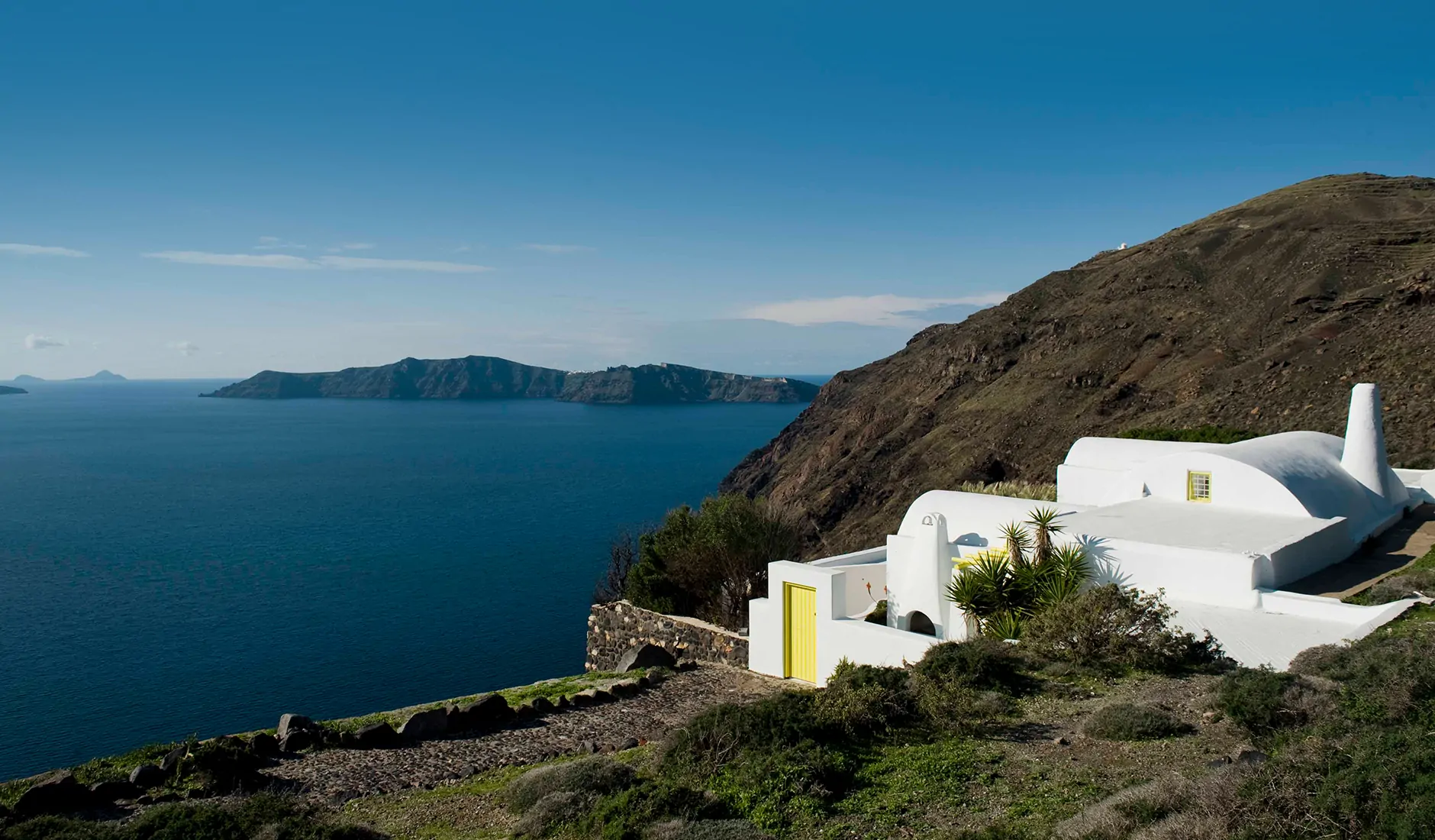 Ftelari Villa stands in a spot so quiet that it feels worlds apart from the tourist trails of Santorini. The house’s character and design emphasize and transform its tranquil location.