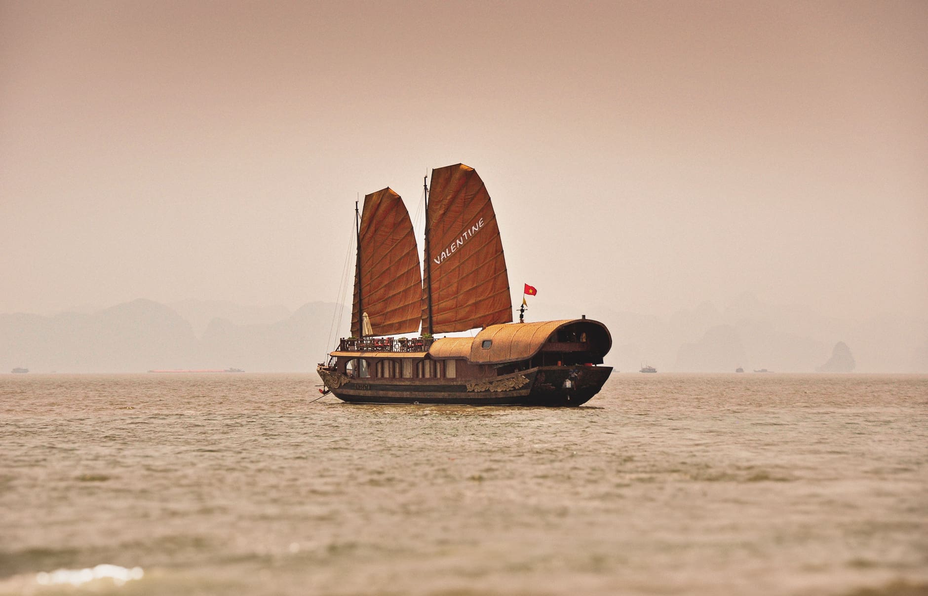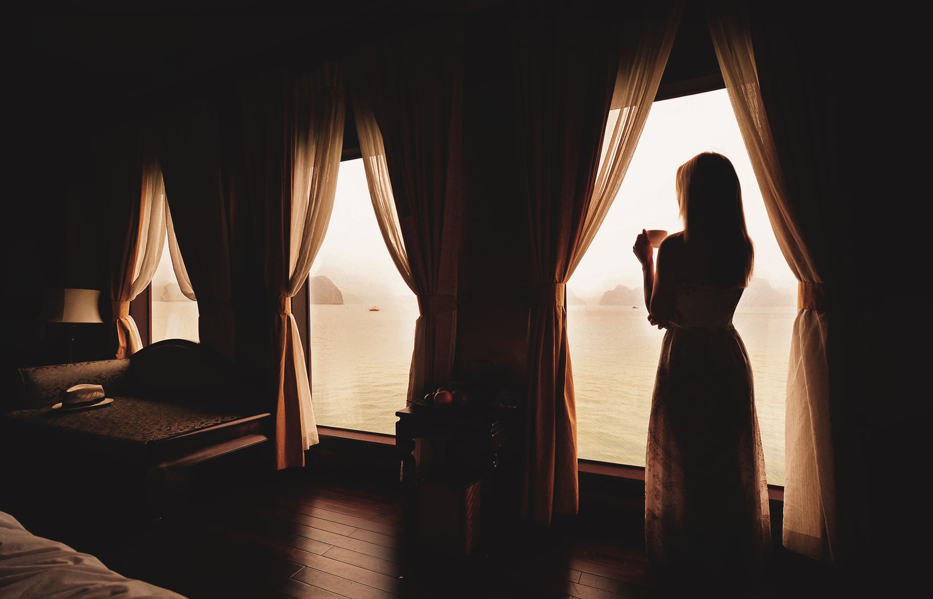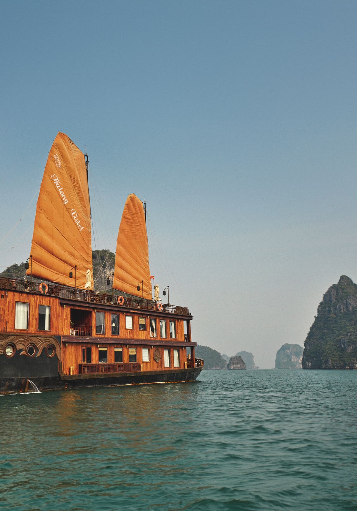We booked a cabin in the Heritage Line Violet Cruise, a five-star boutique junk boat fitted out in the 1930s Indochine style, with golden sails, polished woodwork, and refined Asian décor. Our cabin was a colonial-style suite, complete with authentic furniture, luxury fittings, and a balcony overhanging the misty waters as the ship navigated the karst archipelagos.