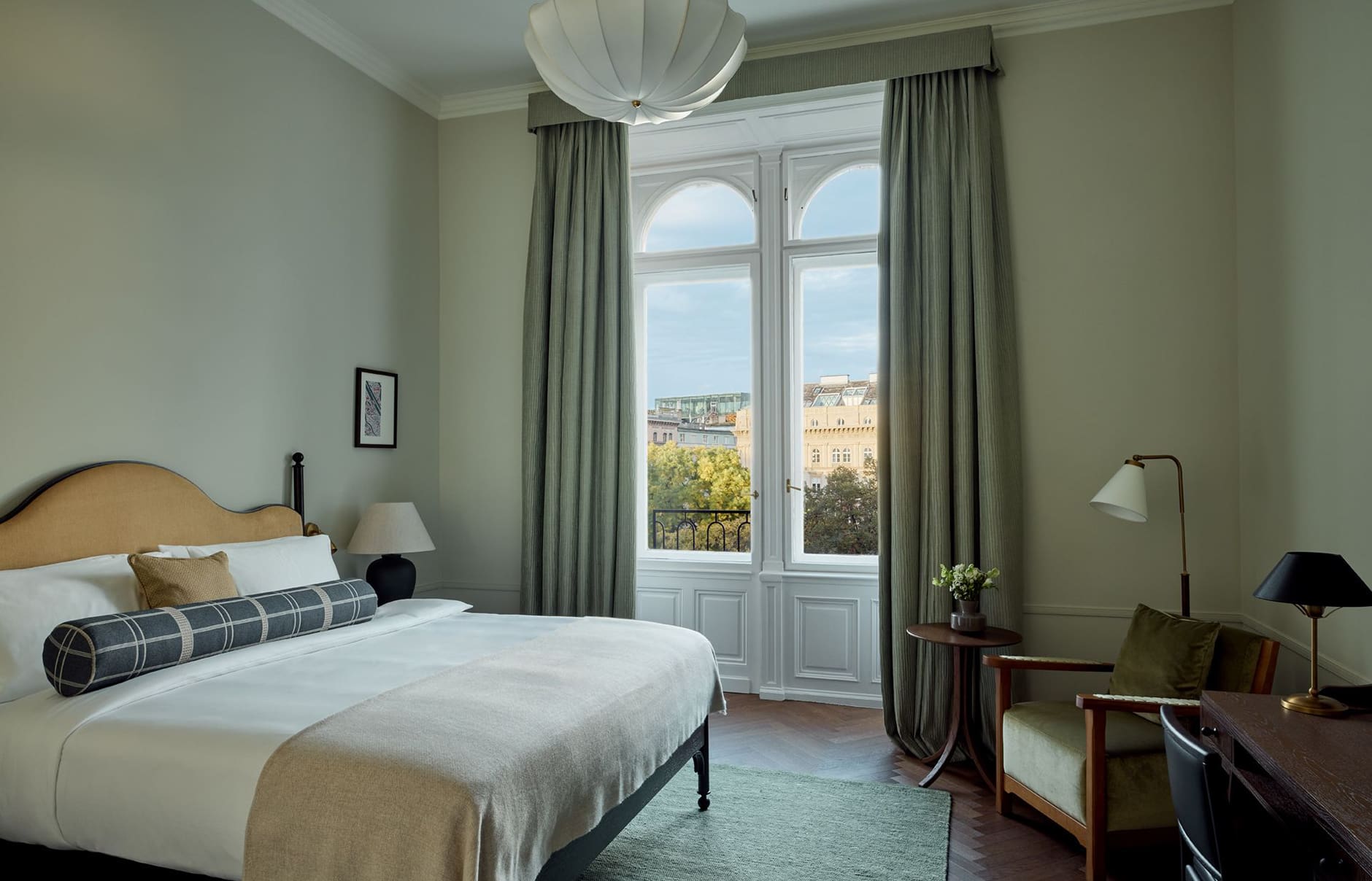 Housed in a restored 1884 neo-Renaissance building, Sir Prague is a 76-room hotel that seamlessly weaves the city’s artistic heritage into modern hospitality. Designed by Linda Boronkay, the interiors blend Gothic drama, Cubist geometry, and Art Nouveau grace — with bespoke Czech craftsmanship evident in every detail, from embroidered headboards to sculptural lighting.
