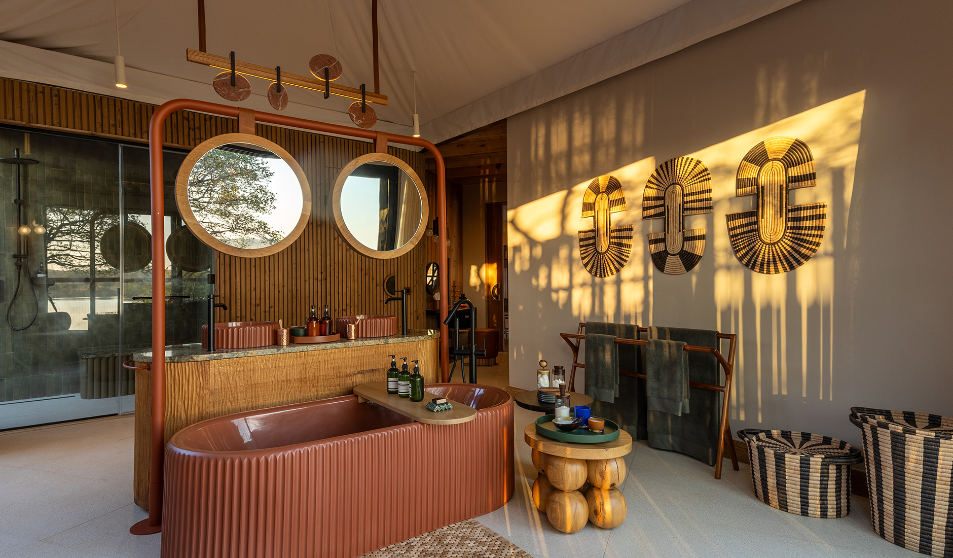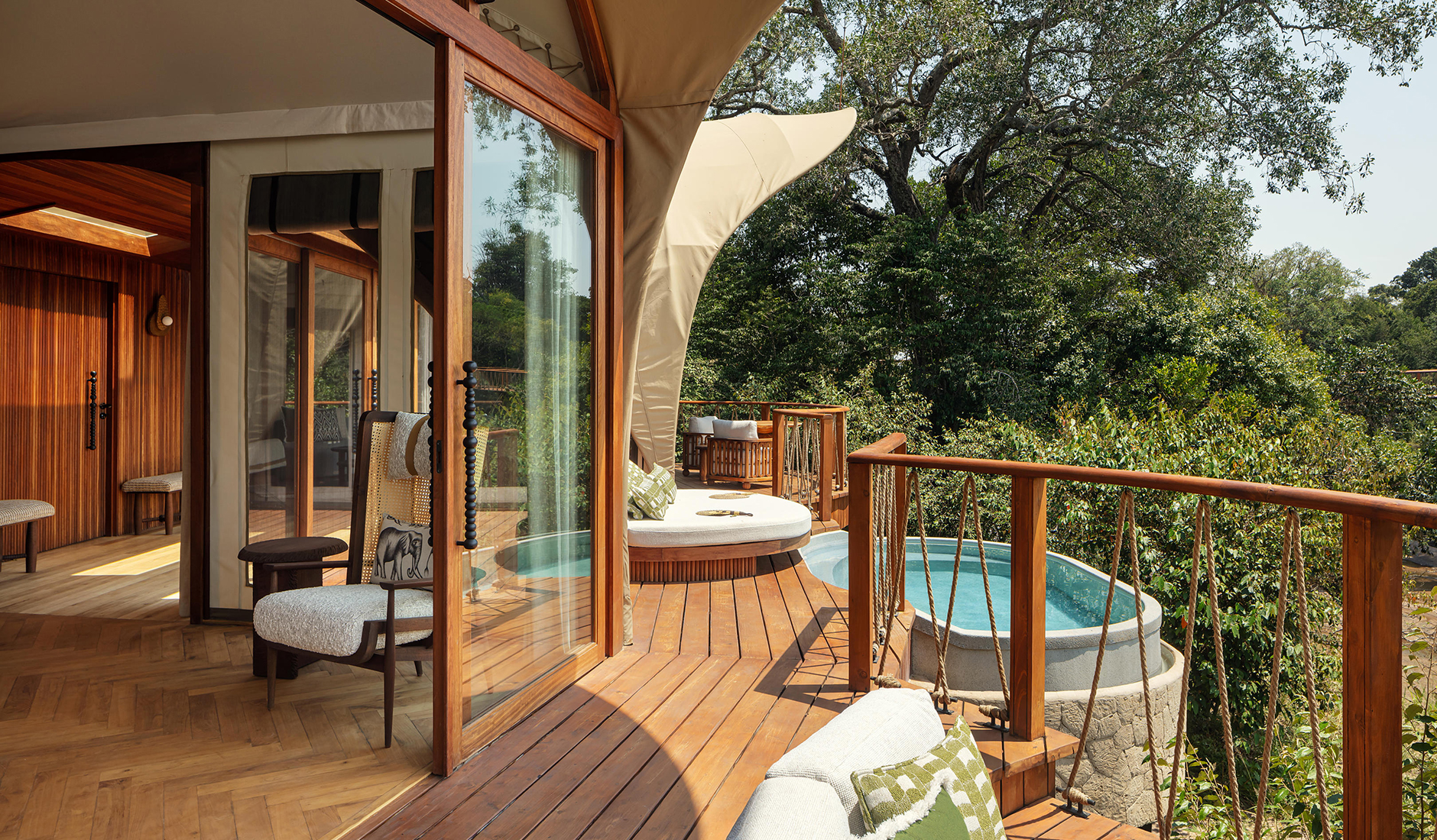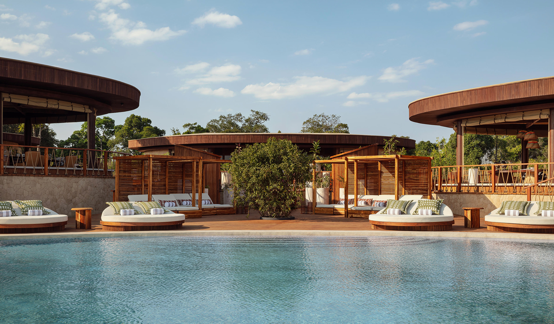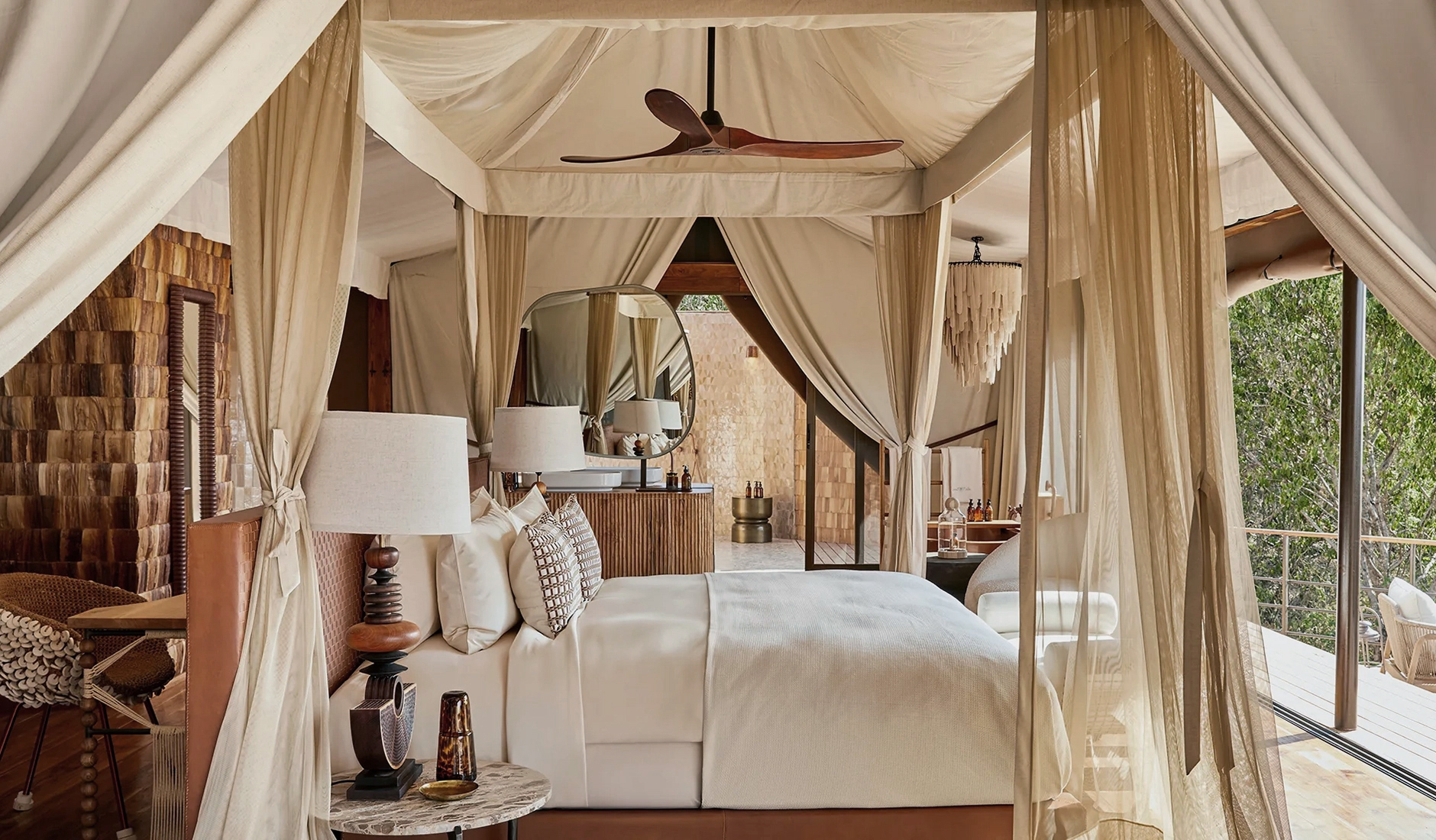 Ubuyu, named for the local baobab fruit, is Banyan Group’s first safari venture. Set in Tanzania’s Ruaha National Park, the six-villa property is designed for a minimal footprint: solar power runs the camp, and the timber, thatch, and clay structures echo traditional Maasai dwellings. The social hub, called the Living Room, flows like a Maasai enkang, while the Mganga Bar frames views of the river. Dining emphasizes plant-forward, zero-waste cuisine rather than typical game-focused safari menus. The Maji Spa on the riverbank offers wellness treatments in a tranquil setting, and ‘Escape Hosts’ guide guests through the camp instead of conventional butlers, fostering a more relaxed vibe.