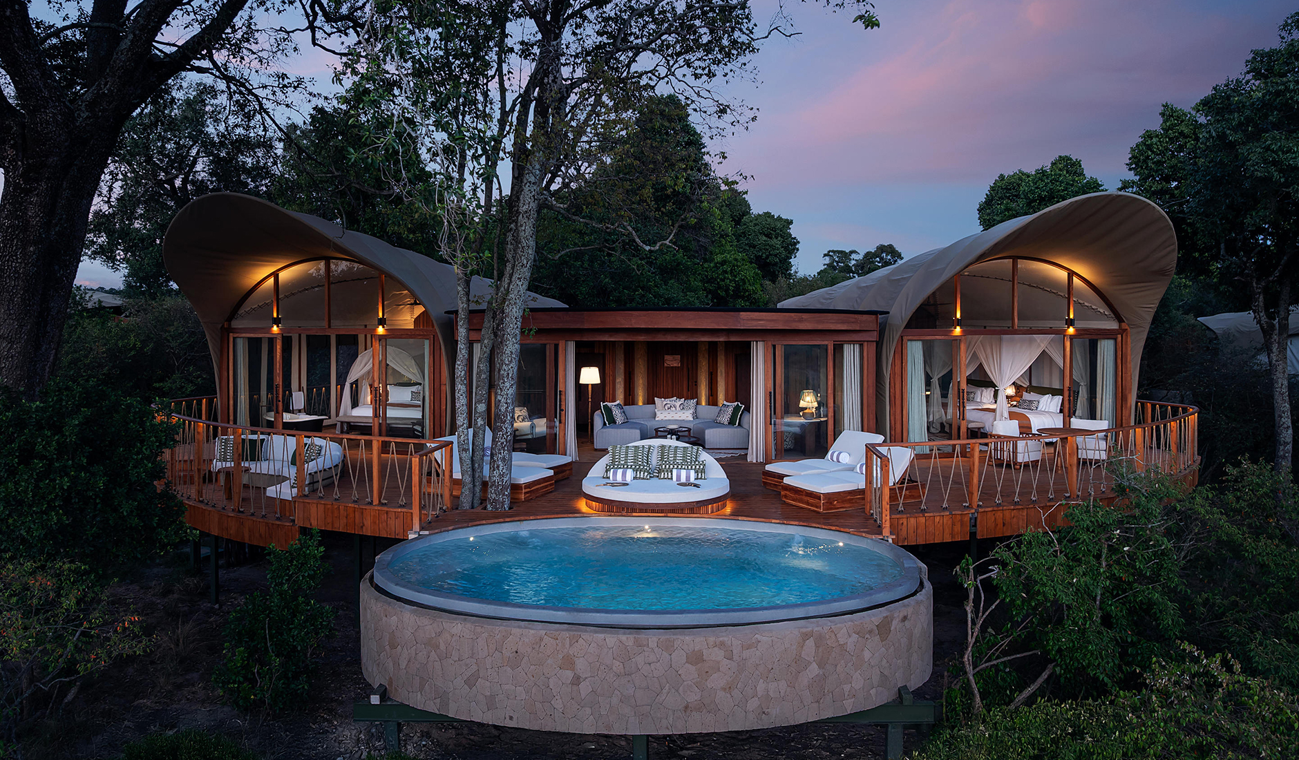 JW Marriott Mount Kenya Rhino Reserve Safari Camp is set in the heart of Kenya’s Solio Game Reserve, between Mount Kenya and the Aberdare Mountains. The camp features 20 tented units, including two two-bedroom suites with private plunge pools, as well as wellness areas, a spa, multiple dining venues, and a conservation house. 64,000 acres of protected wilderness ensure sightings of rhinos, leopards, cheetahs, and plains game. Highlights include horse-riding safaris, night drives, guided nature walks, quad biking, and visits to the reserve’s private rhino orphanage.