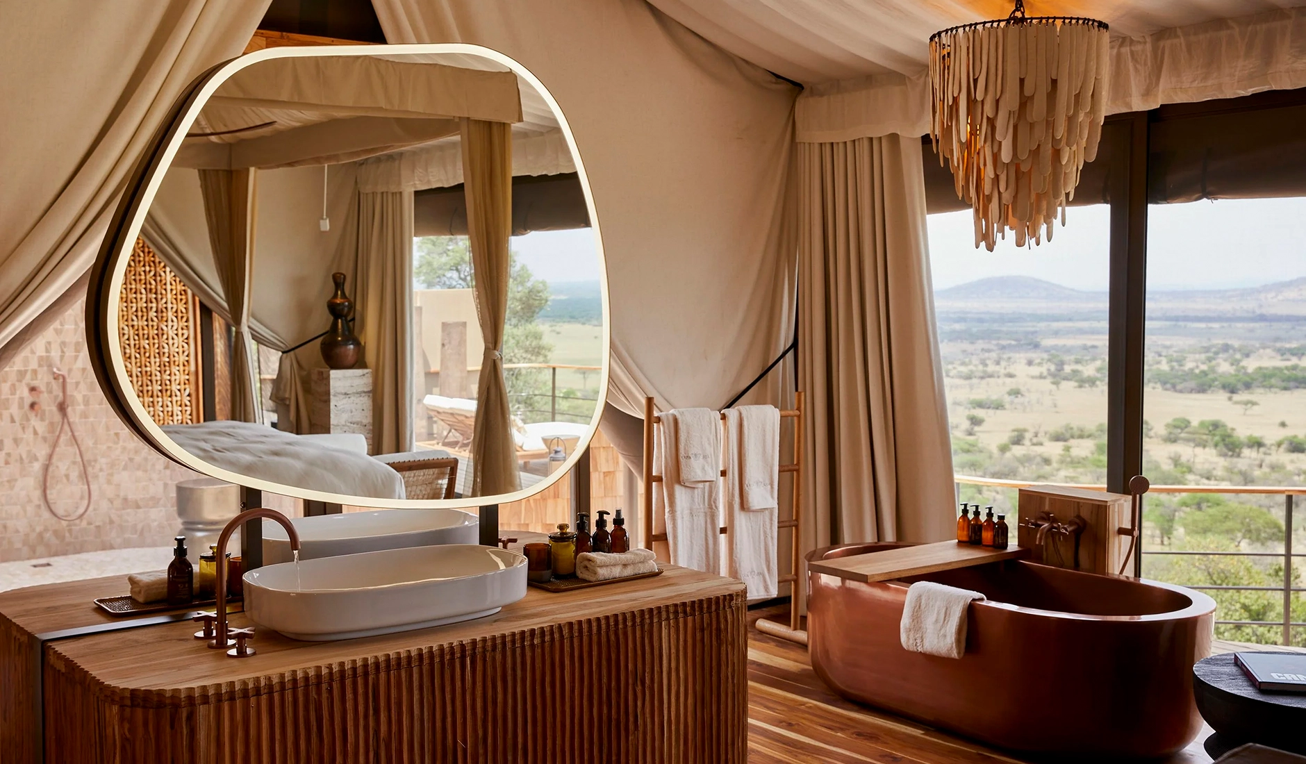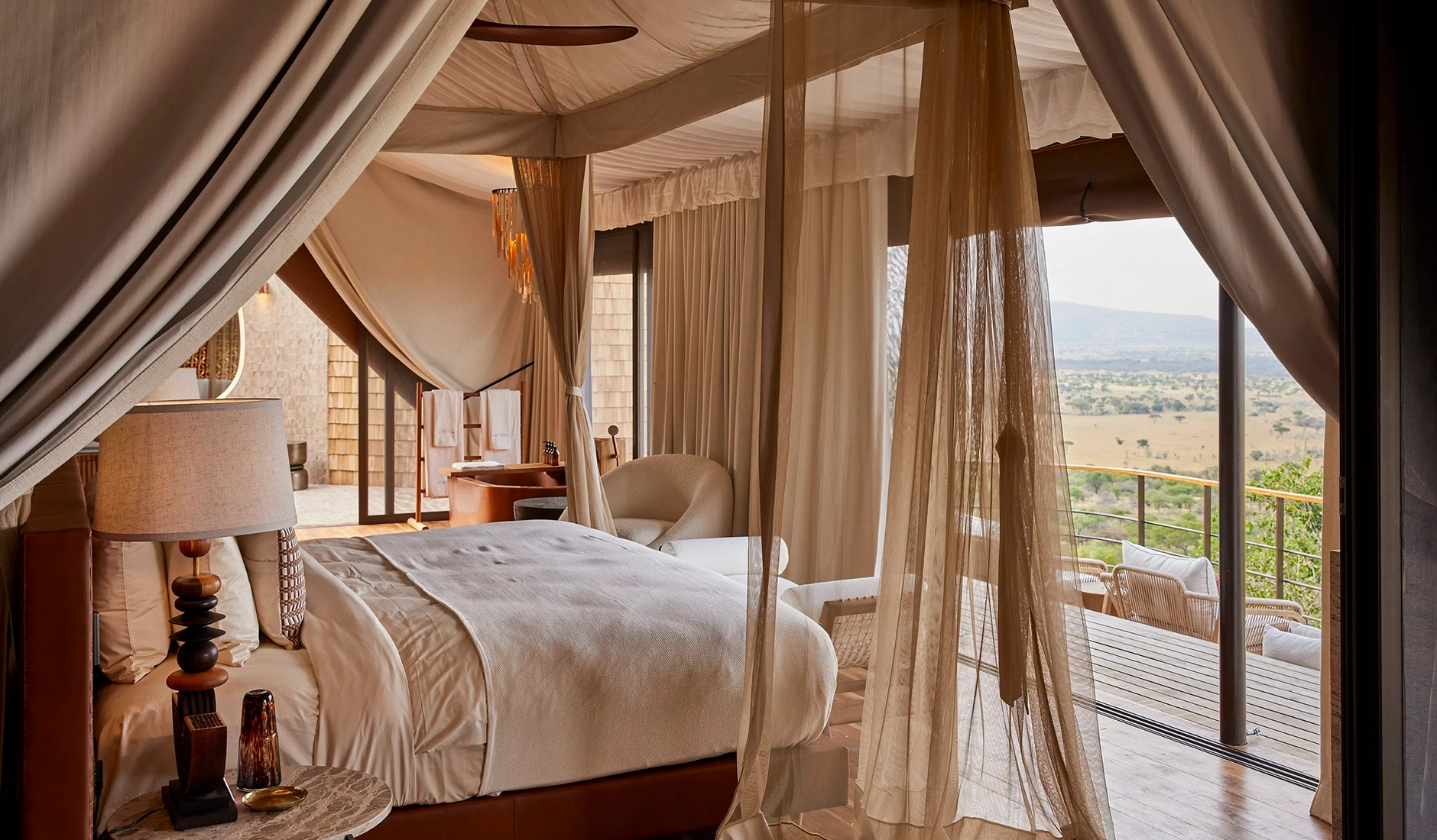 The Ritz-Carlton Masai Mara Safari Camp offers refined comfort in the heart of Kenya’s wilderness, set along the banks of the Sand River. The camp features 20 spacious tented suites and a four-bedroom Presidential Suite, each with indoor-outdoor showers, private decks, and plunge pools that open onto the surrounding landscape. Game drives, guided nature walks, and early morning hot-air balloon rides over the Mara plains are all part of the experience. Cultural encounters with the Maasai community, bush breakfasts under the open sky, and Maasai-style boma feasts in the evenings are other highlights. Locally inspired dining, combined with attentive service, ensures each stay blends the rhythms of the wilderness with sophisticated comfort.