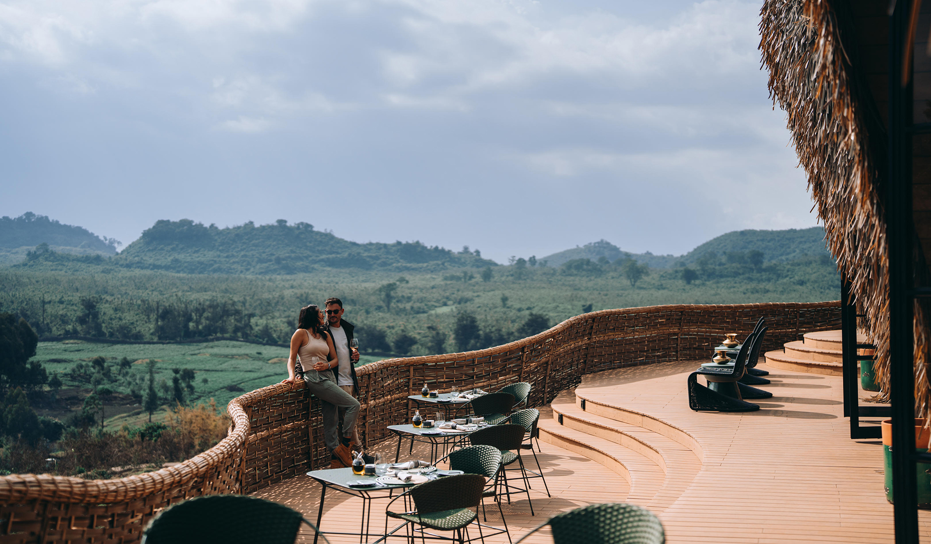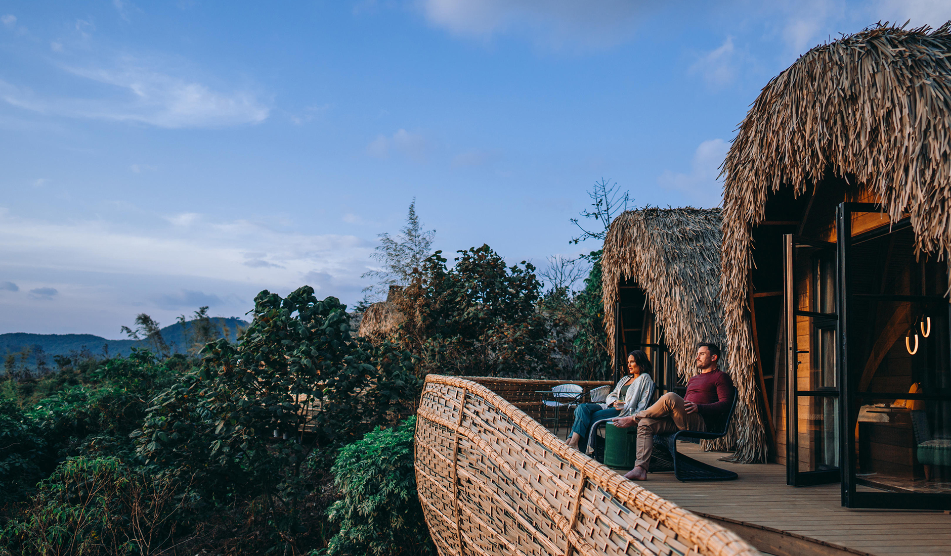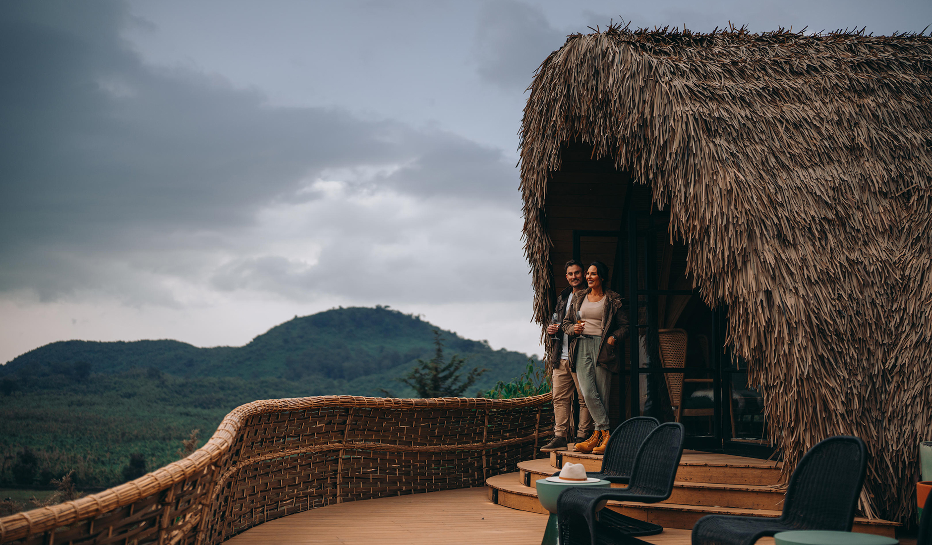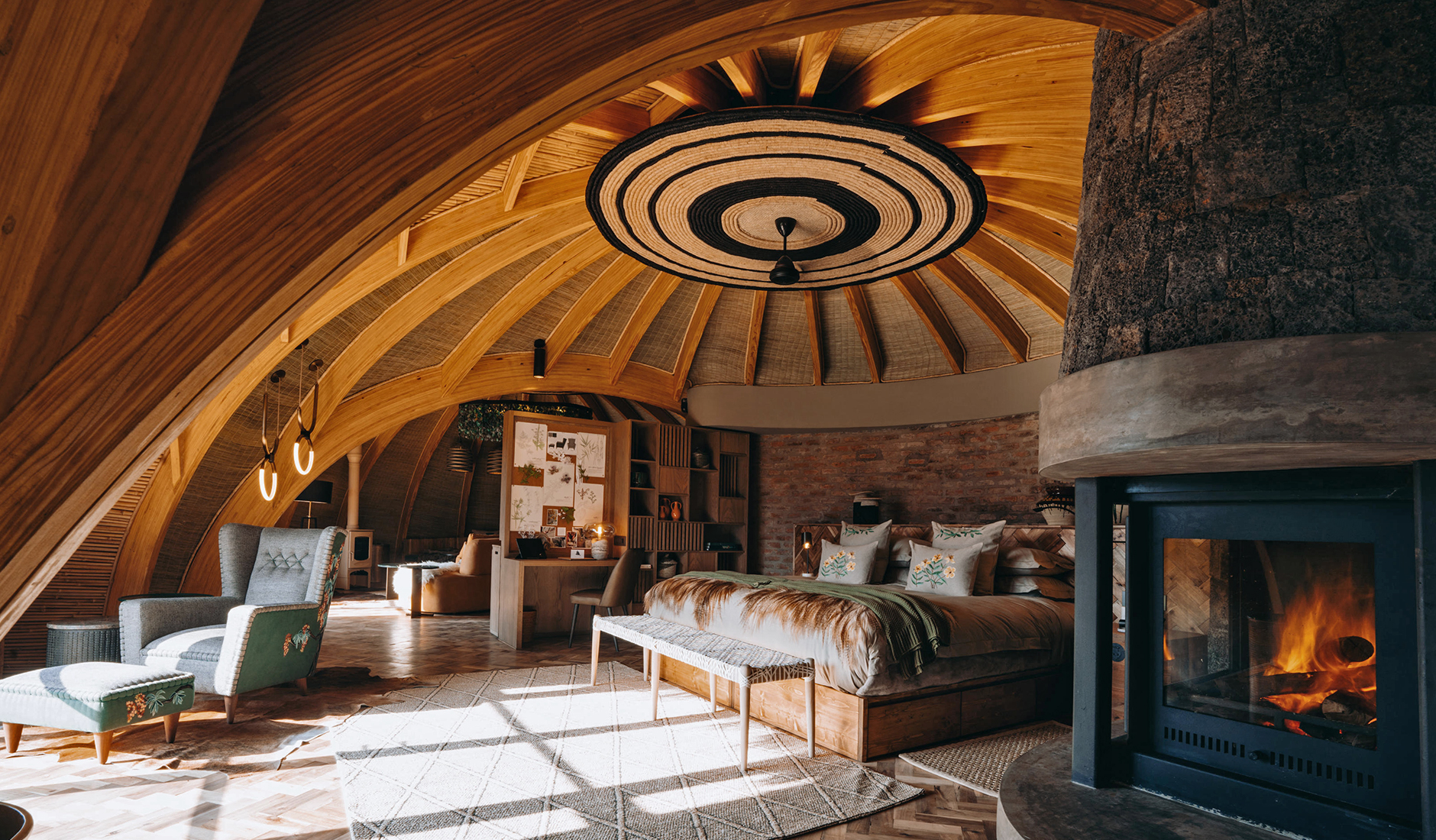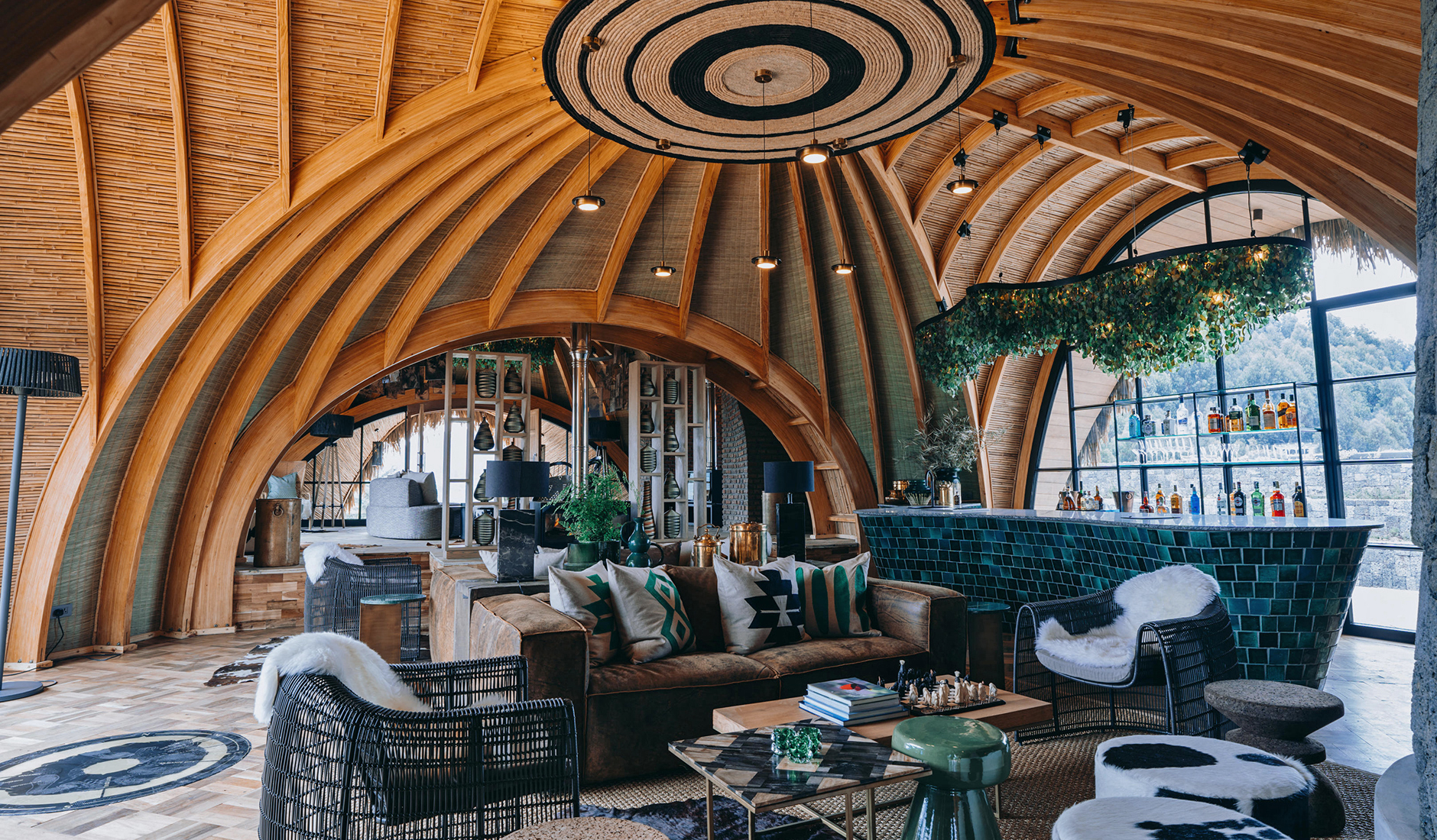 Eight bamboo-built suites, designed by Pablo Luna Studio, curve and step down the slope of the land, their rooflines echoing the forested escarpment. Interiors are designed for the misty, cool climate, with fireplaces and expansive decks that invite guests to watch the forest awaken. The lodge cascades down toward a heated pool and an open-air bar, creating a series of intimate spaces that follow the site’s natural gradient.
