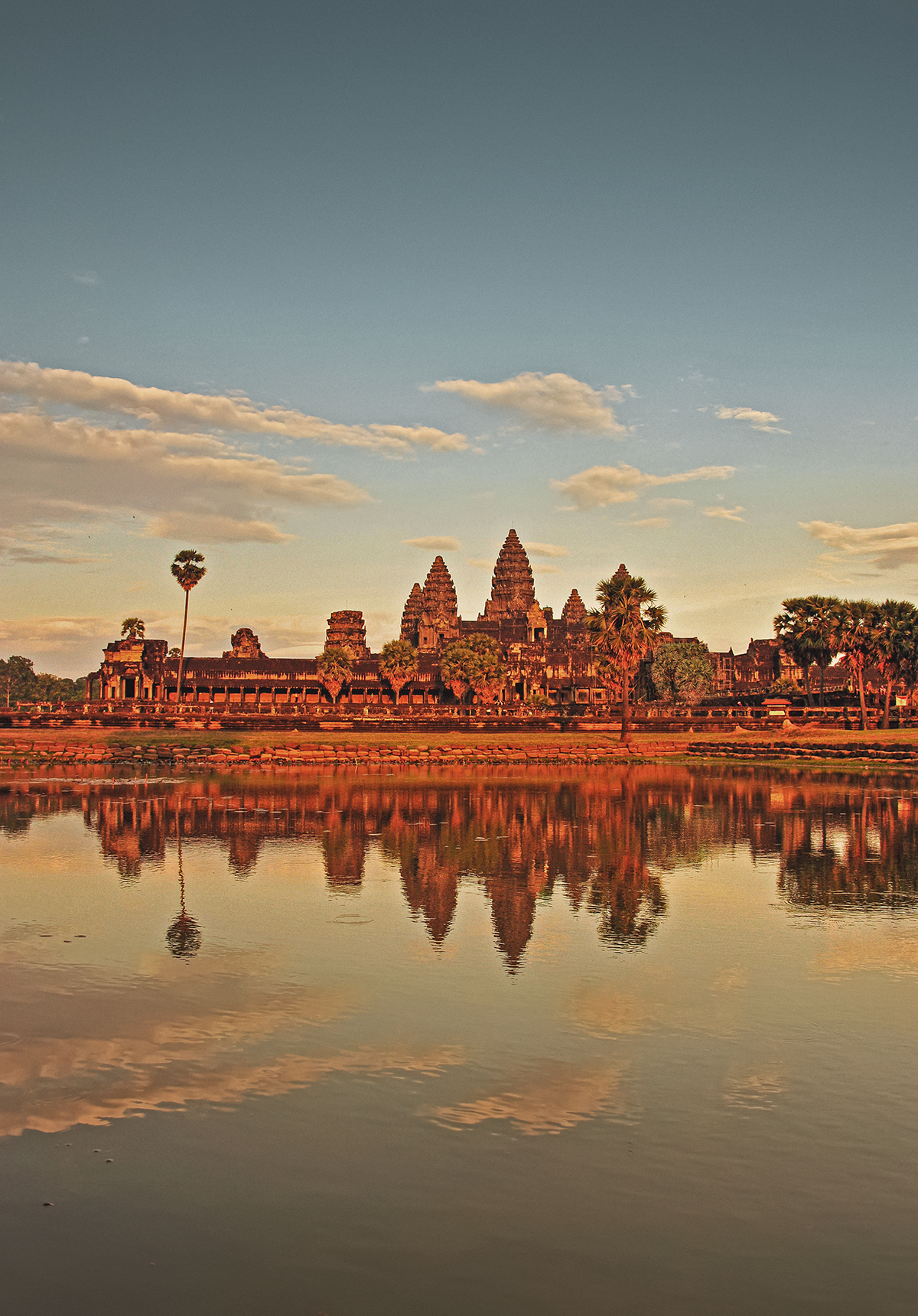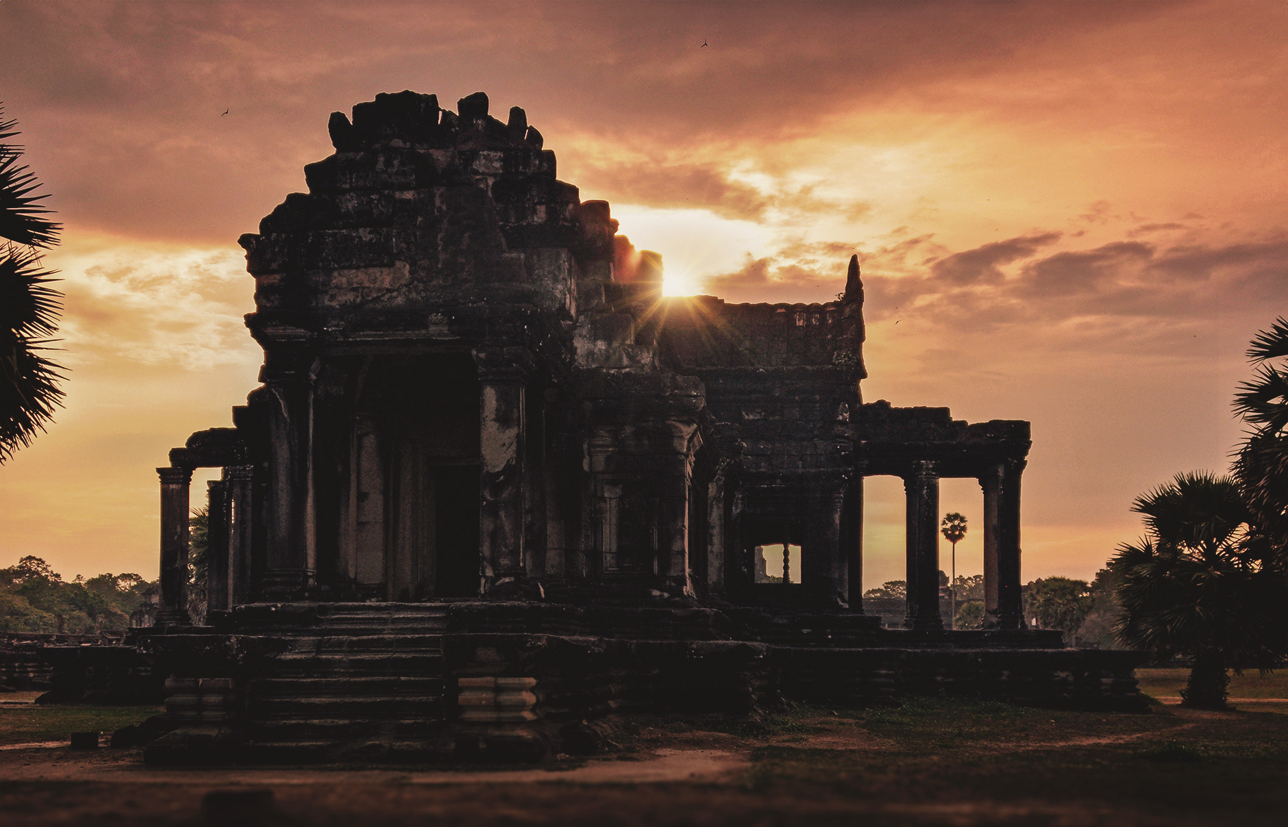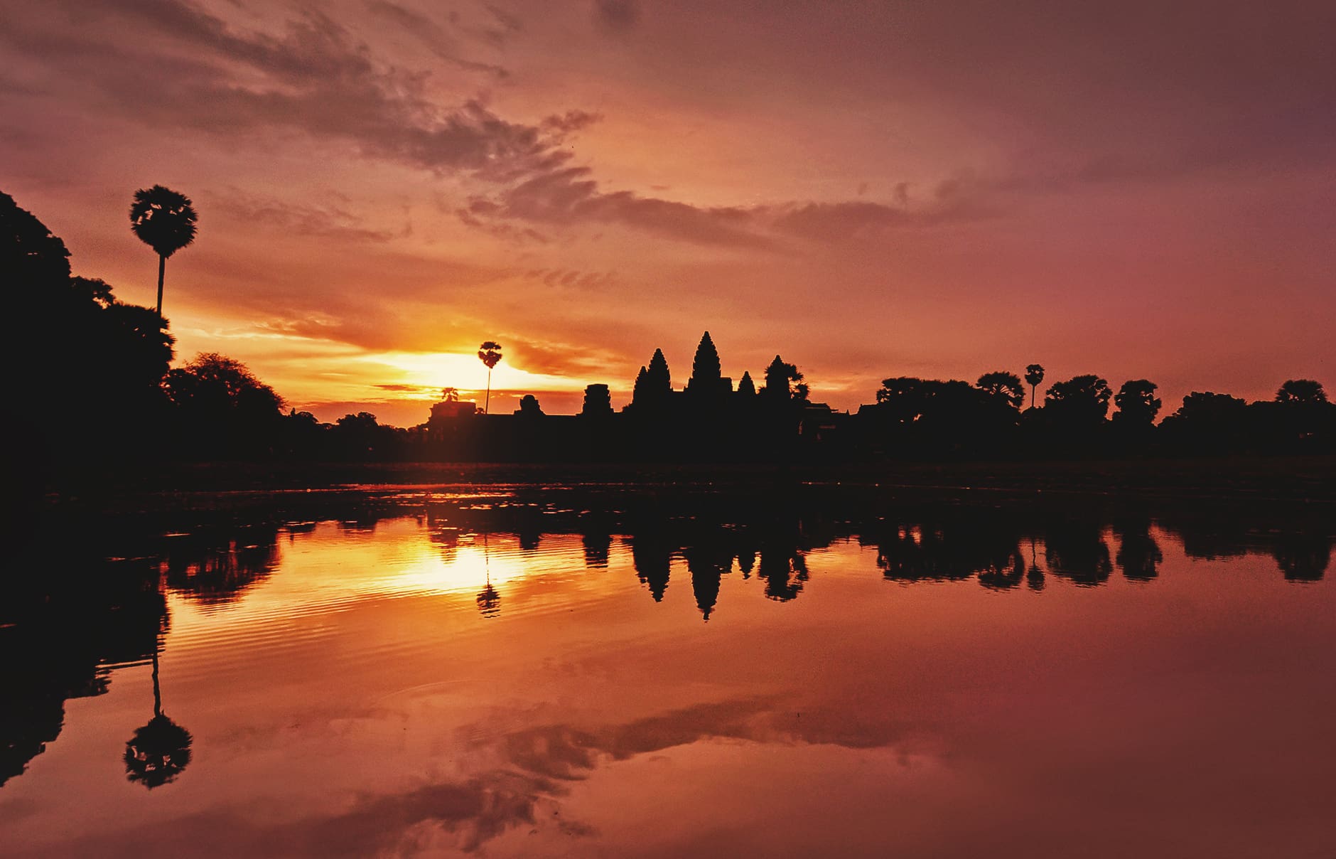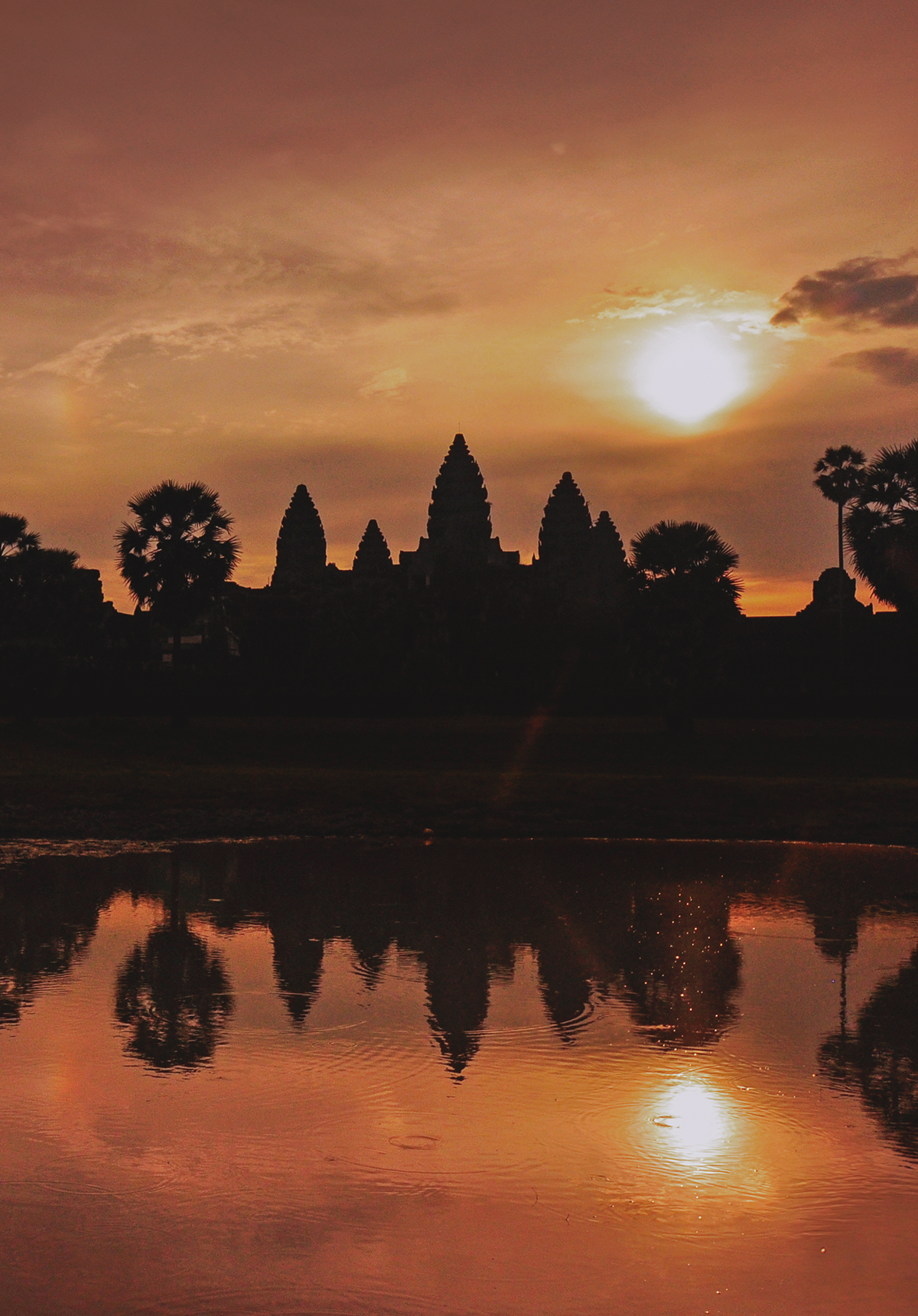 Sunrise can be dramatic, but the sharp contrast of the sky aflame and temple towers sharply reflected in the ponds makes them mere silhouettes.