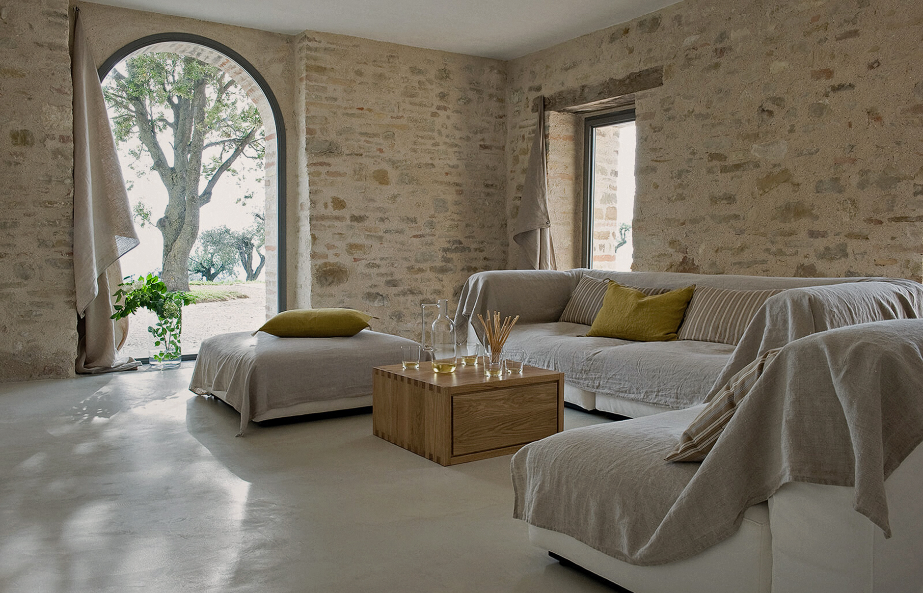 Inside, the designers of Casa Olivi left many walls bare. The charming rustic pattern of bricks and mortar bring in warmth to the spaces, which are otherwise almost minimalist.