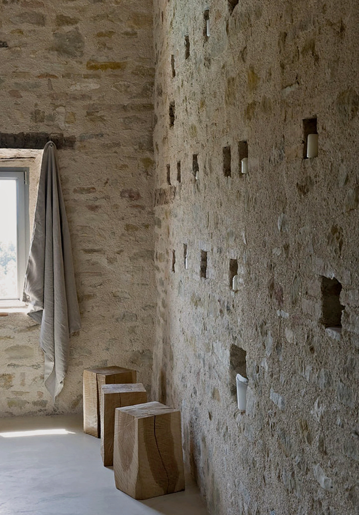 Having survived a devastating fire a few years ago, the shell of this three-story 18th-century farmhouse fell under the protection of the Italian Cultural and History Administration, which overlooked the renovation. With the help of swiss architects Jerome de Meuron and Markus Wespi, and after four years of work, the building rose from the ashes, more beautiful and precious than ever.