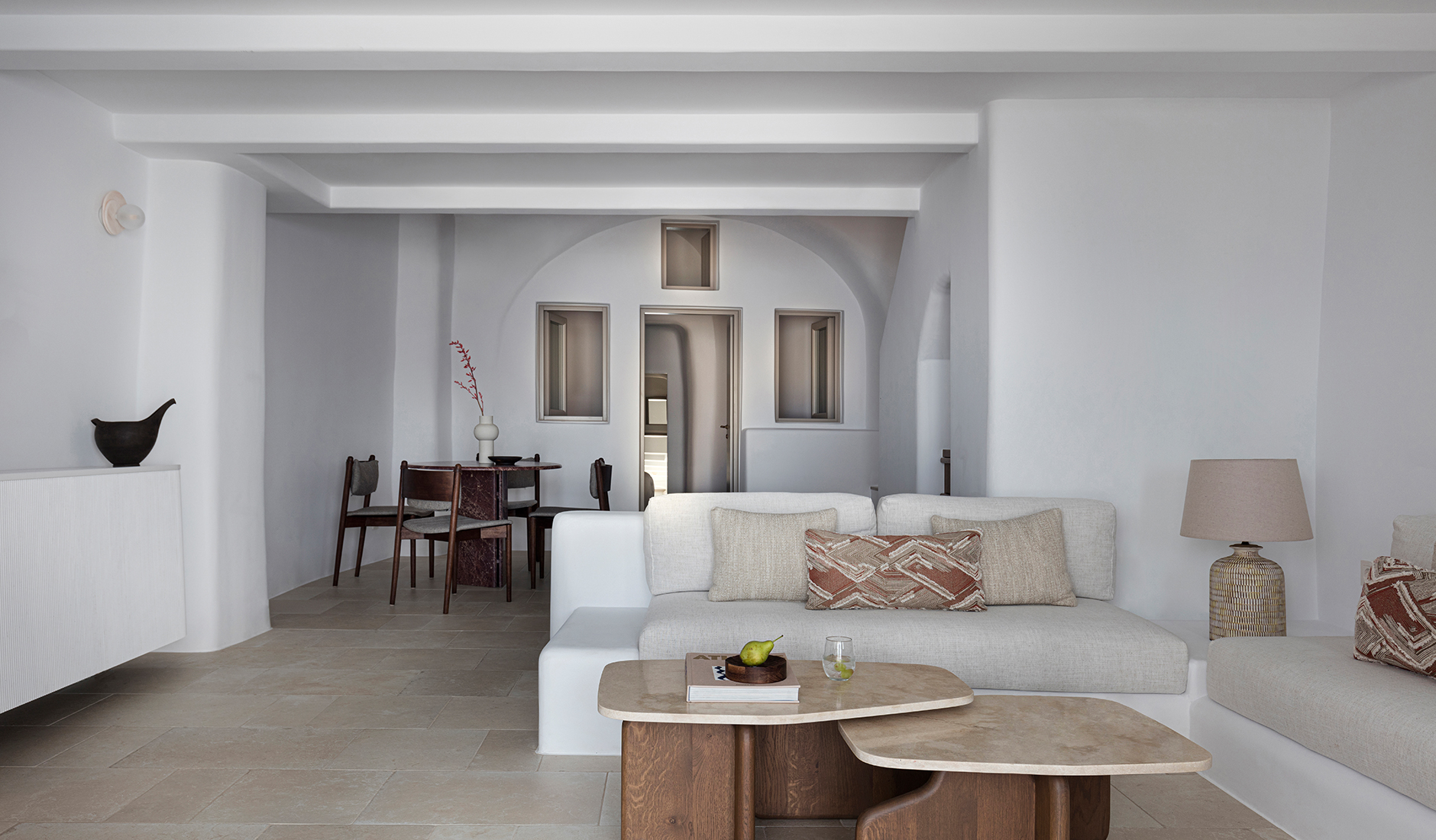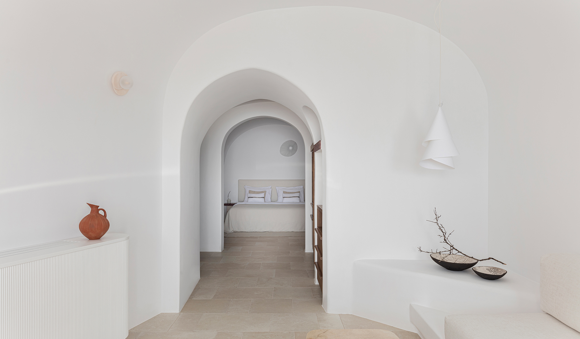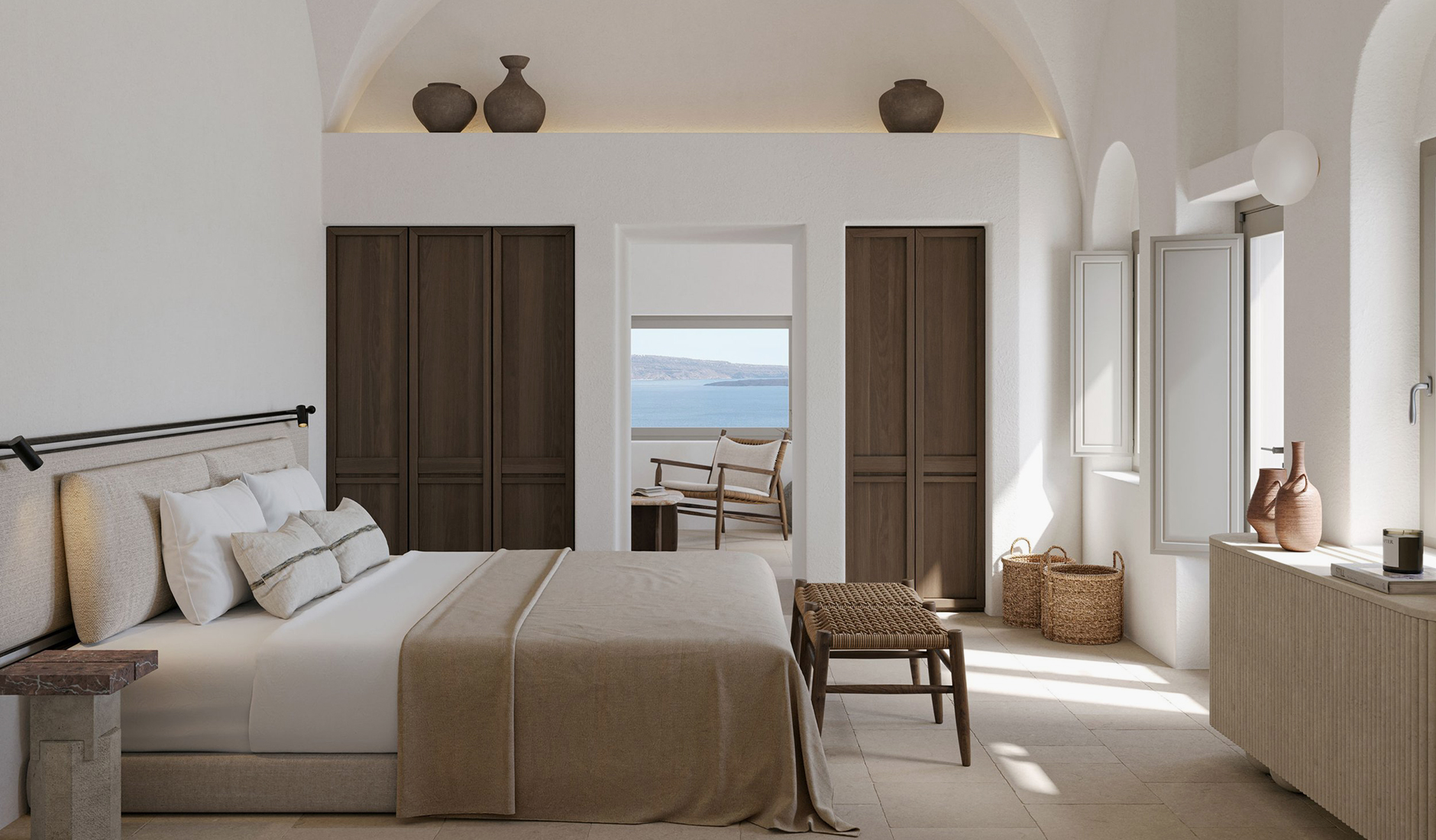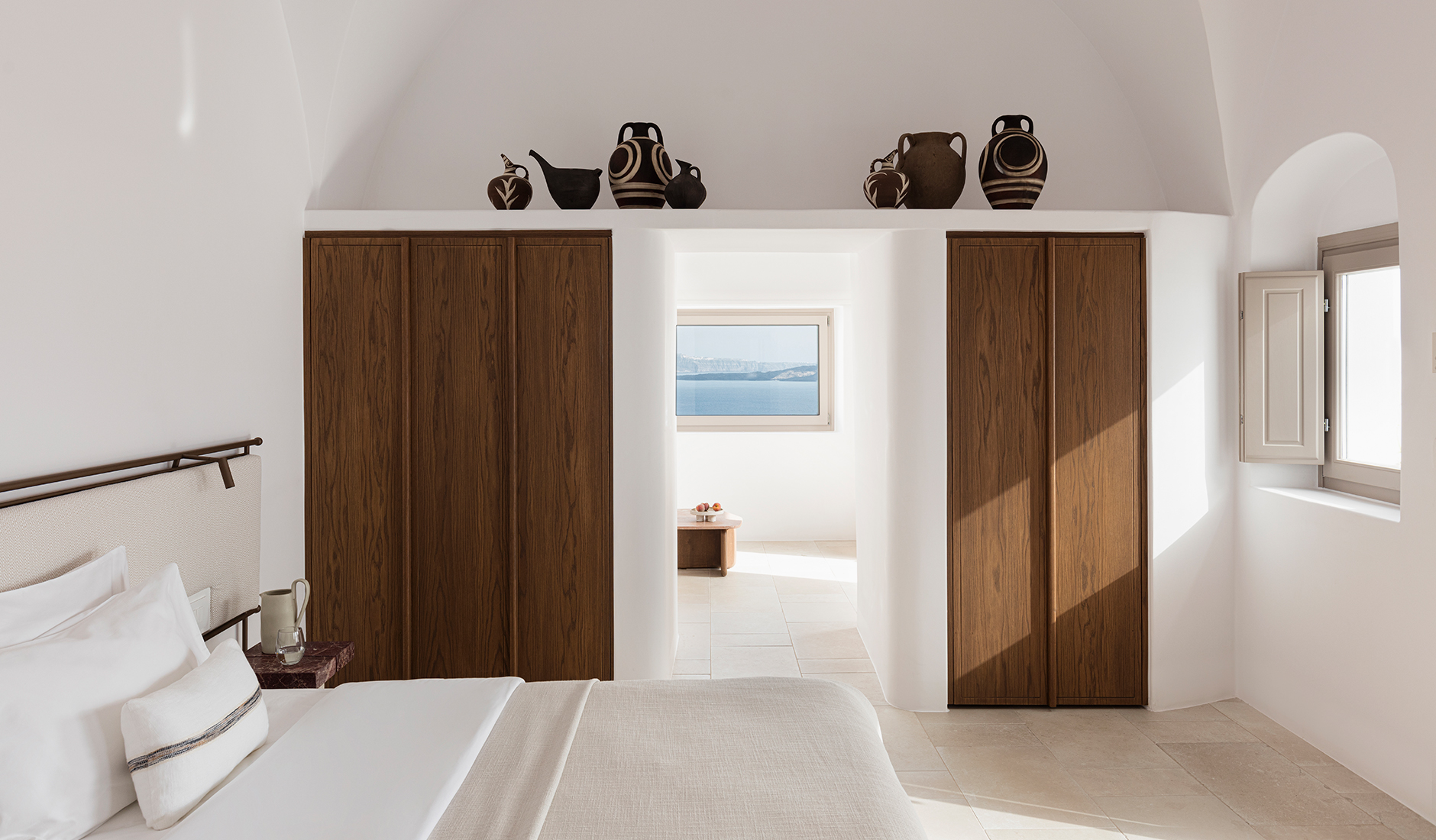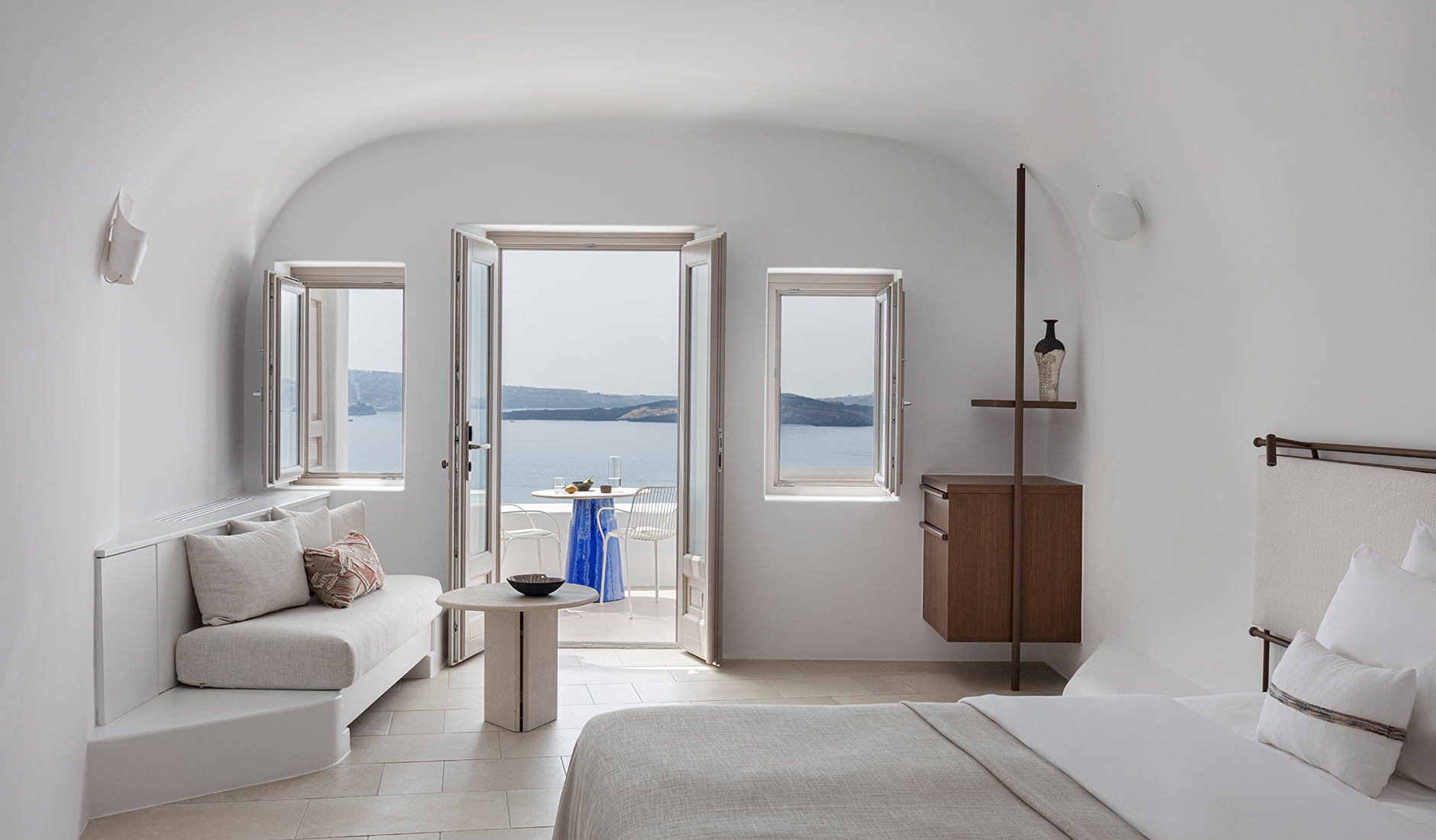 Vora is a property starkly different from the cookie-cutter hotels, all based on the white-and-blue cube houses template. Its interiors are still carved out from the volcanic rock and perched upon the cliff, but it breaks the mold in many ways. For starters, it barely qualifies as a hotel, with only three fully-equipped apartments and hardly any other facilities. But it is the Vora’s style that stands out the most. The interiors are relatively dark, with smooth curves and soft materials creating a feeling of comfort, privacy, and relaxation.