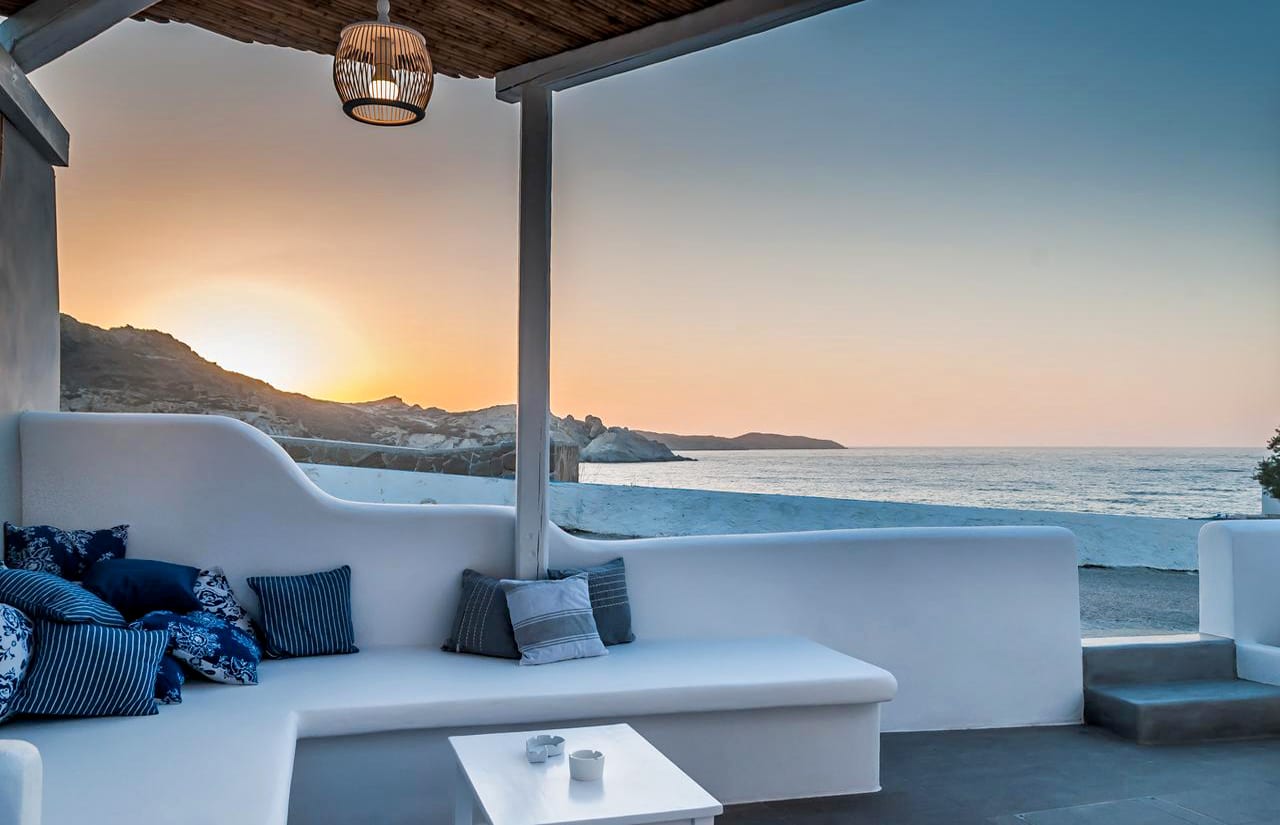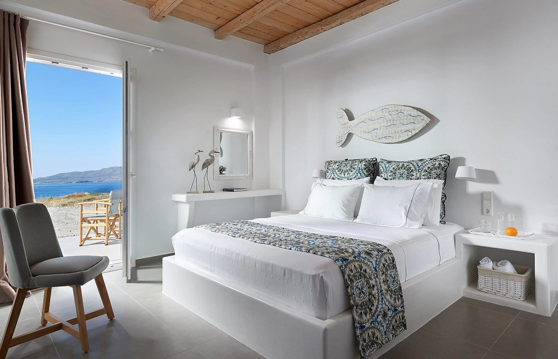 Perched just steps away from the beach in Pollonia, Melian stands as a chic boutique hotel. Its fifteen rooms and suites exude an elegant charm with whitewashed walls, cast iron beds, and handmade furniture. The interiors are adorned with floating white drapes, creating a serene ambiance that perfectly complements the epic sea views that grace each accommodation. The private terraces (many with jacuzzis) are perfect for relaxing with a book or a glass of wine at sunset.