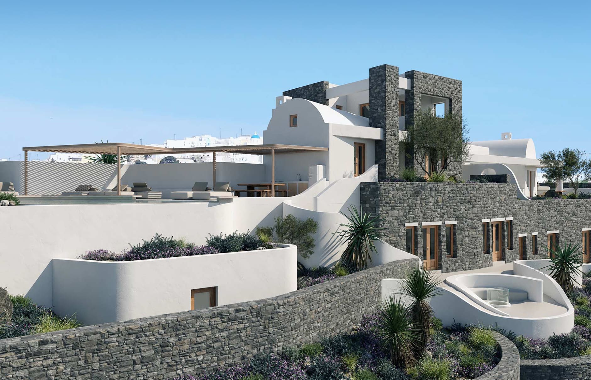 Santo Mine is a luxury hotel carved into the cliffs in the village of Oia, located on an old stone mine site. The resort has 37 individual suites, each with a private pool or jacuzzi, and their design is inspired by Santorini’s volcanic landscapes and Mediterranean aesthetics. Cycladic minimalism defines the interiors. They feature warm tones and natural materials like stone, ceramics, wood, marble, and copper. Among the facilities are a restaurant, bar, wine cellar, spa, and outdoor gym. The hotel’s architecture uses greenery-covered roofs to optimize heat conservation and reduce the resort’s environmental impact.