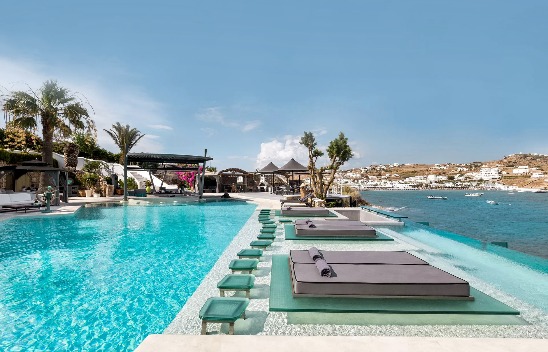 “The main pool terrace is the focal point and is envisioned for romantic moments. Circular ‘loveseats,’ chic swings, and cushioned loungers all invite to cuddle with the loved one.” — The Best Luxury Hotels in Mykonos, by TravelPlusStyle