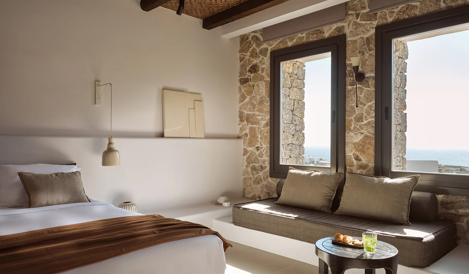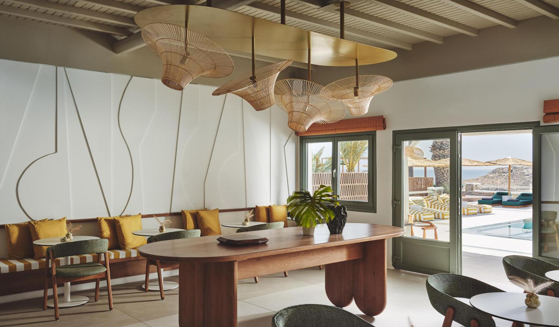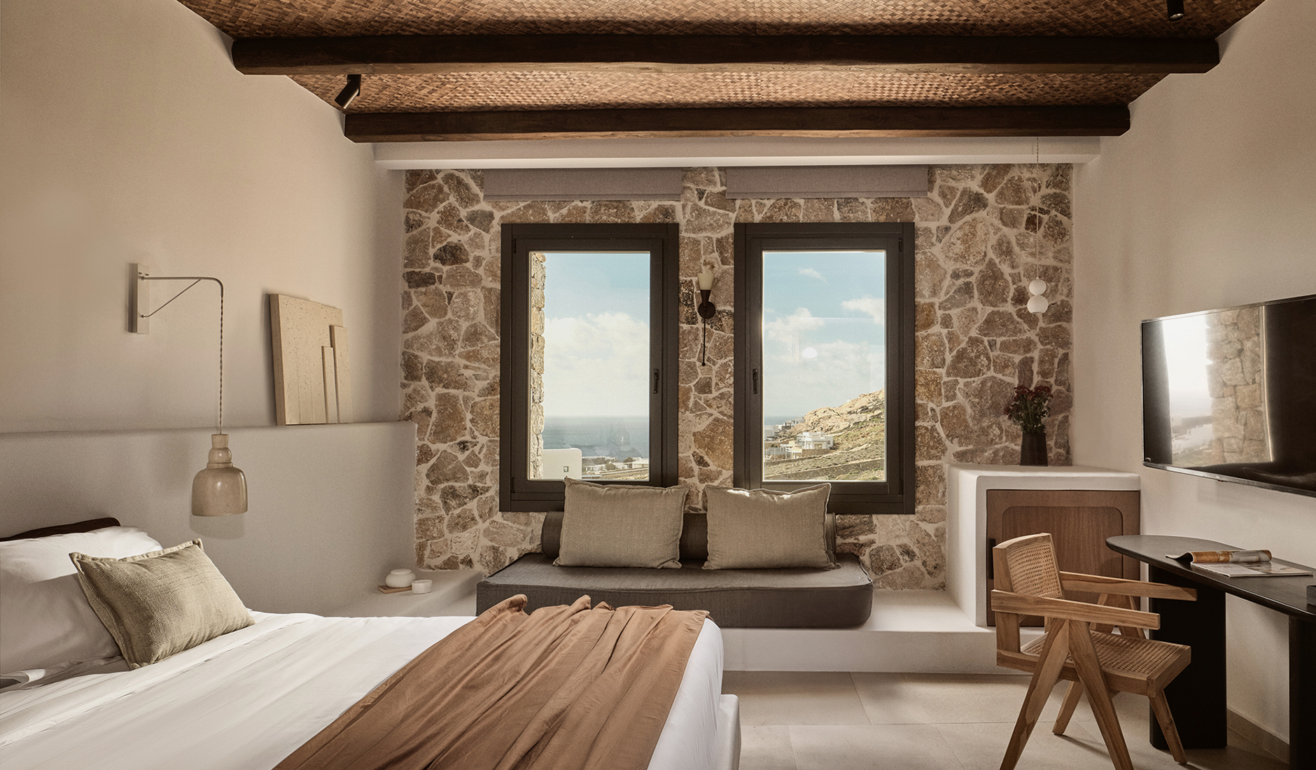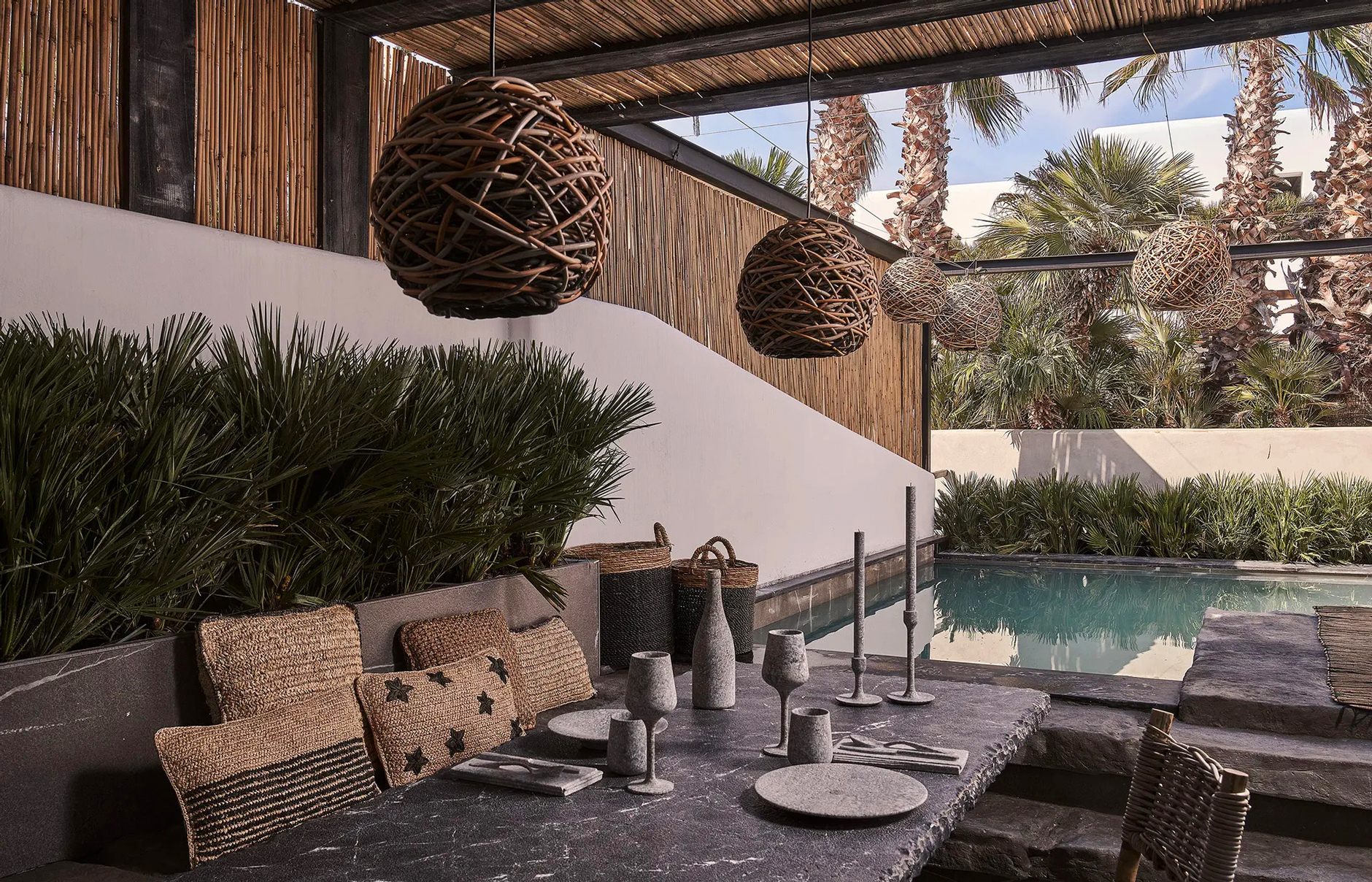 Located on the shores of Ornos Bay, Ananea Mykonos is a 26-room adults-only hotel. The island has a fun-loving spirit, and Ananea embraces a laid-back vibe. Themes of relaxation, simple luxury, and the Greek concept of paréa—spending time with friends—are reflected in the hotel’s design. Its architecture draws inspiration from traditional whitewashed Cycladic houses, with organic, clean lines. The interiors capture the island’s easygoing nature through hand-woven fabrics, local art, and organic materials in bleached whites, lush greens, azure blues, and earthy browns. At the heart of the hotel is the swimming pool and an outdoor restaurant that embodies the essence of slow living.