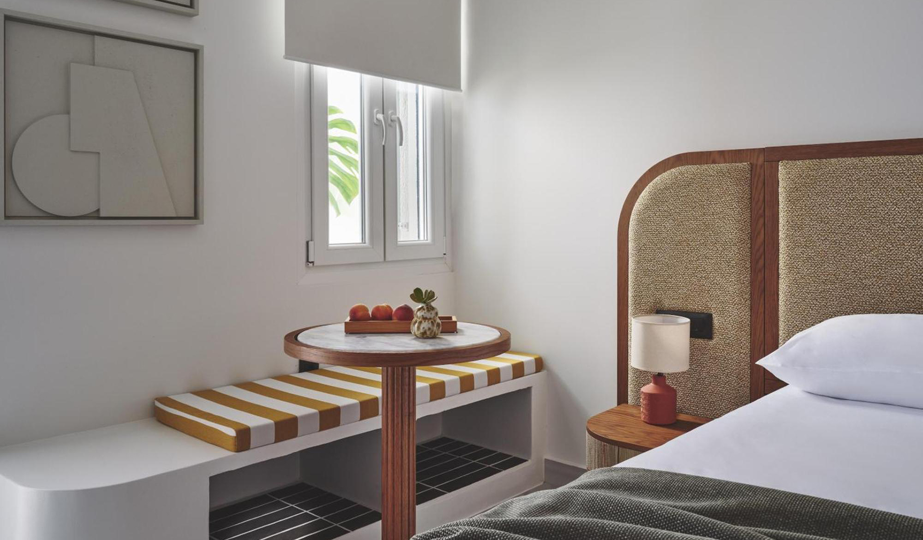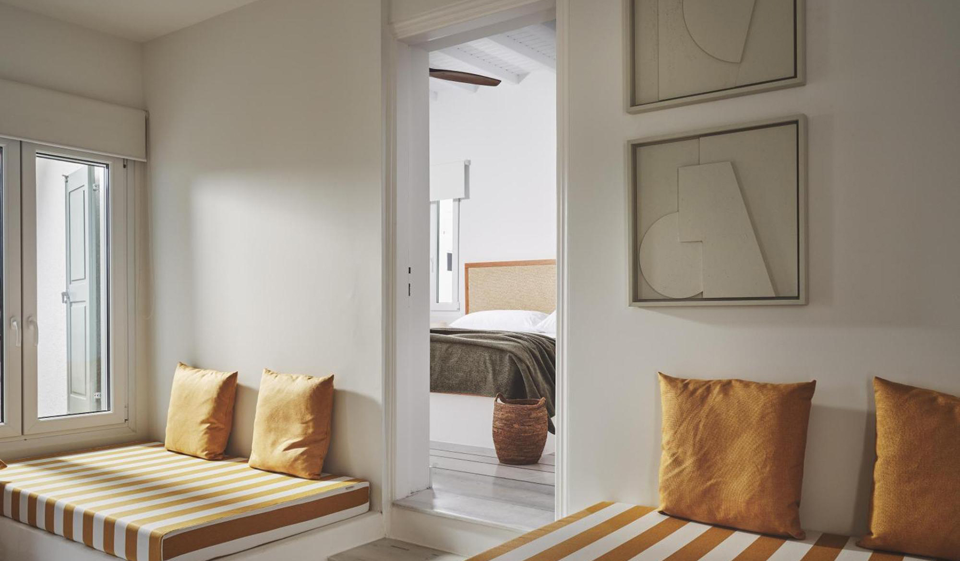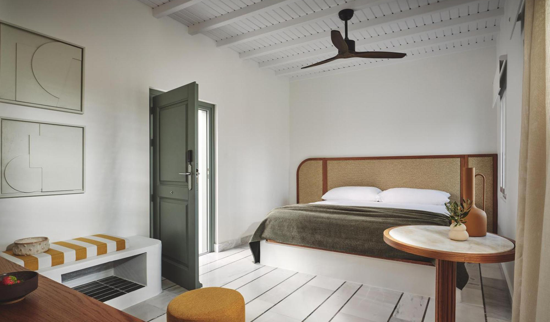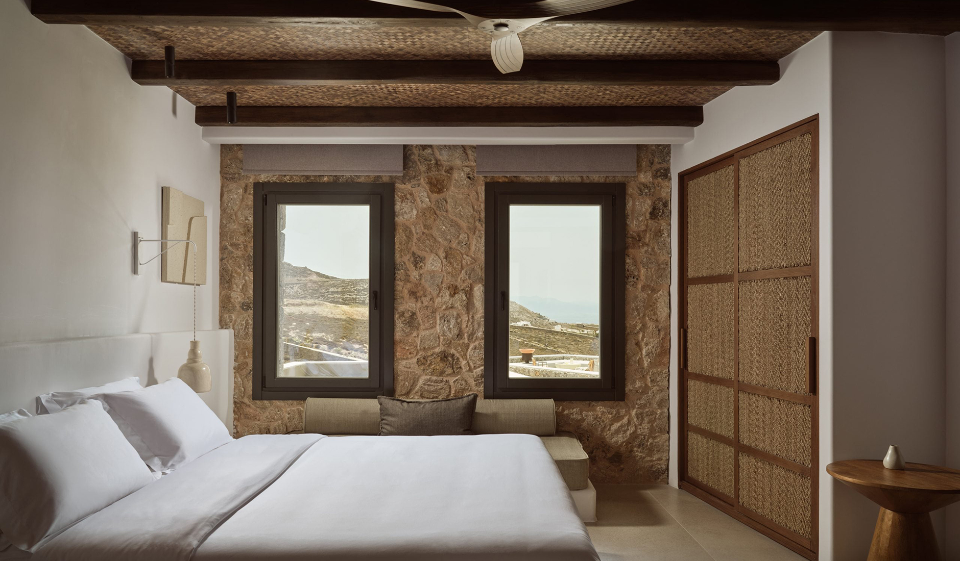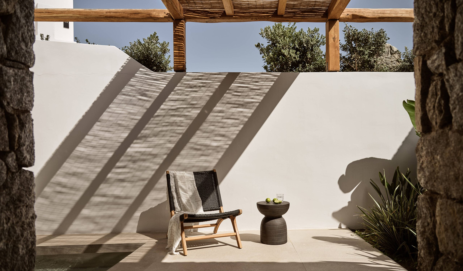 Located on the shores of Ornos Bay, Ananea Mykonos is a 26-room adults-only hotel. The island has a fun-loving spirit, and Ananea embraces a laid-back vibe. Themes of relaxation, simple luxury, and the Greek concept of paréa—spending time with friends—are reflected in the hotel’s design. Its architecture draws inspiration from traditional whitewashed Cycladic houses, with organic, clean lines. The interiors capture the island’s easygoing nature through hand-woven fabrics, local art, and organic materials in bleached whites, lush greens, azure blues, and earthy browns. At the heart of the hotel is the swimming pool and an outdoor restaurant that embodies the essence of slow living.