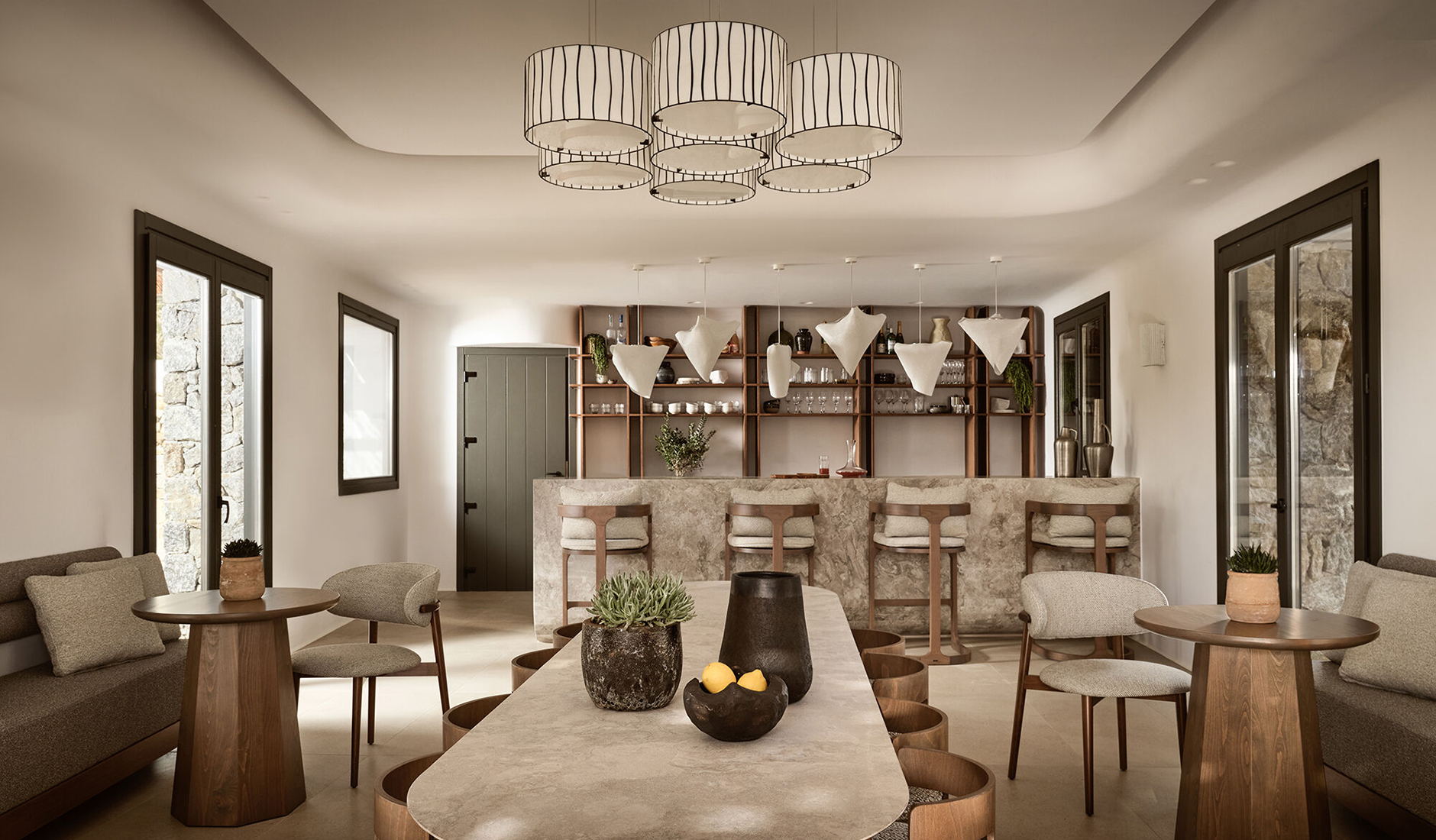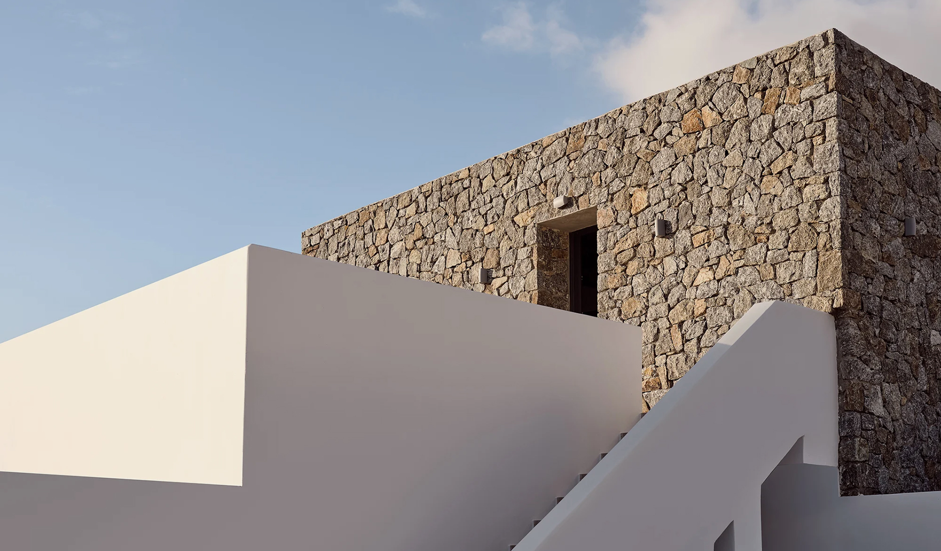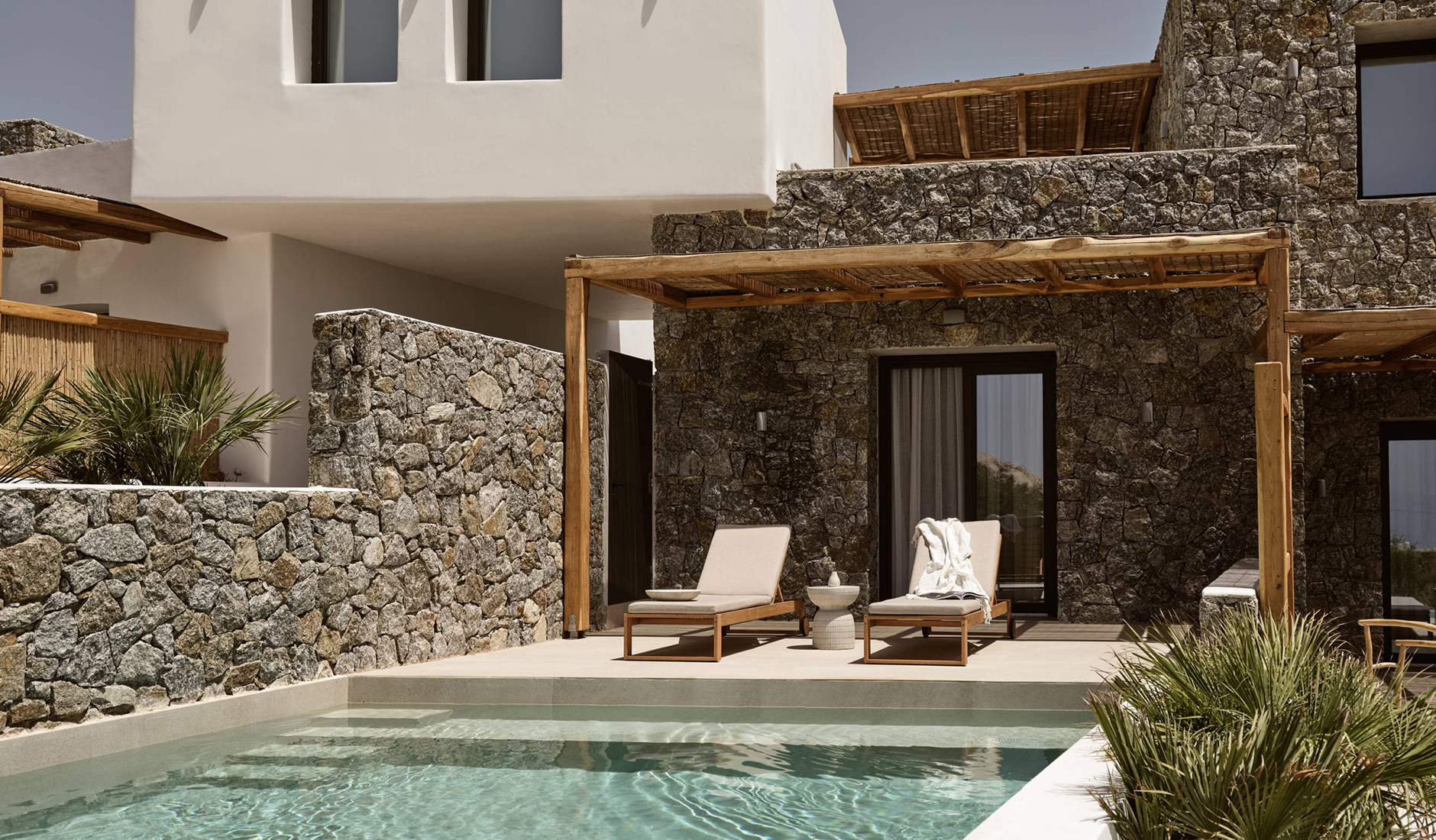 Anemelia Mykonos Hotel is perched above Lia Beach on the southeastern coast of the island. It offers 18 thoughtfully designed rooms that embrace Cycladic architecture, and its layout prioritizes indoor comfort and communal outdoor spaces. A welcoming reception area leads directly to the pool bar; the pool sits between the restaurant and panoramic sea views. The spa, designed as a modern cave retreat, offers a secluded sanctuary beneath the main area. Designed by A&M, the hotel reflects the island’s natural beauty through stone walls, whitewashed masonry, and wooden pergolas that echo Mykonos’ charming alleys and sandy shores.