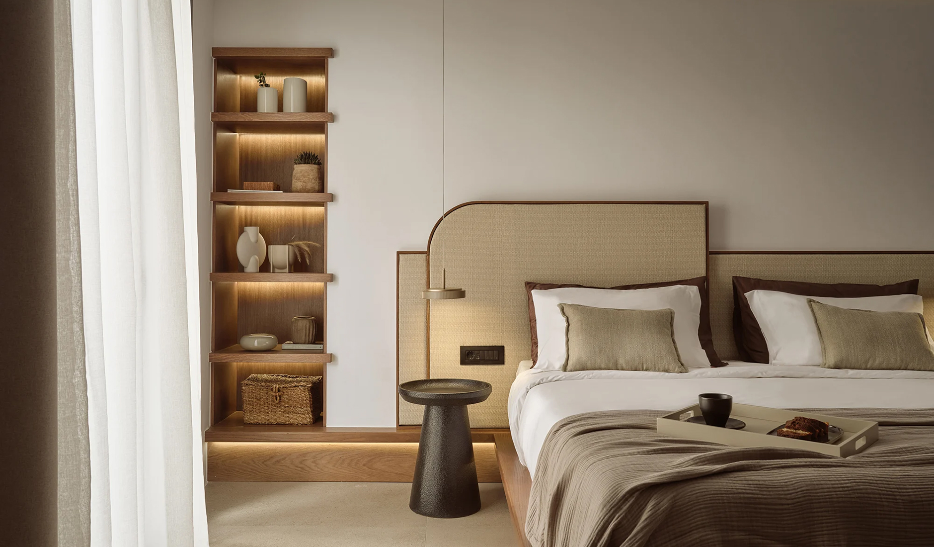 The twenty-four-room Rocabella pays tribute to the white Cycladic architecture and the island’s topography. Its design highlights the natural aesthetics of simple materials and stylistic choices, such as polished cement set in creamy tones contrasted with dark wood. Rocabella enjoys a privileged location close to the coastline of the Agios Stefanos village and has lovely views of Mykonos town. The hotel’s main swimming pool terrace (featuring a pool bar and reception) is designed to highlight the panoramic views.