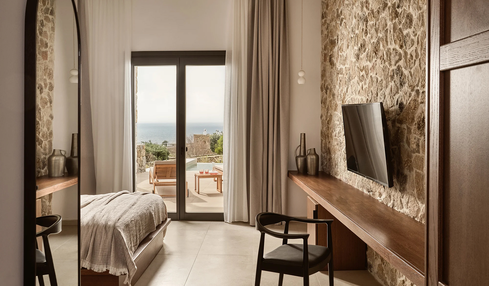 The bohemian chic of Amyth of Mykonos combines rustic details, contemporary comforts, and modern amenities, offering a relaxed island vacation experience. Understated furnishings, plush linens, tactile materials, and whitewashed hues and earth tones underscore the style. However, it is the authentic, warm, and welcoming atmosphere that makes all the difference, creating a “home away from home” feel. The hotel comprises seventeen suites in five categories, with the Amyth Sea View Pool Suite standing as the top accommodation category. This suite boasts a private terrace with a large sunbed and a private swimming pool.