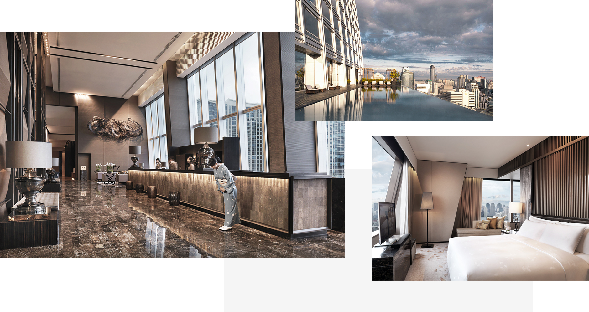 The 171-room Waldorf Astoria hotel is housed on ten floors of the 60-floor Magnolias Ratchadamri complex, which sits at the center of the entertainment and shopping hub of Ratchaprasong. The rooms feature marble bathrooms with separate showers and bathtubs — and Salvatore Ferragamo bathroom scents. Guests staying at Waldorf Astoria have access to a rooftop restaurant, two bars, an indulgent wellness spa, and even a golf course. An outdoor pool with floating cabanas is temperature-controlled. A magnolia flower inspired the magnificent architecture and design of the property.