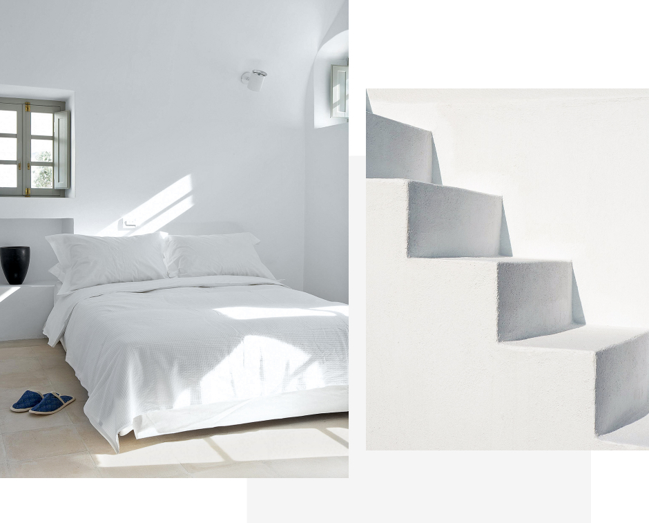 Villa Fabrica is unlike most Santorini hotels, which are typified by the organically shaped white-cube architecture and bedrooms located in dark caves. Still, a deep understanding of the location’s history underlays its design. The white polished cement and eco–friendly materials are a canvas to the splendor of Fabrica’s high ceilings, natural light, and minimalist furnishings. Some of the mill machinery left in situ, sculpture-like, became part of the décor, giving the property a unique, quirky character.