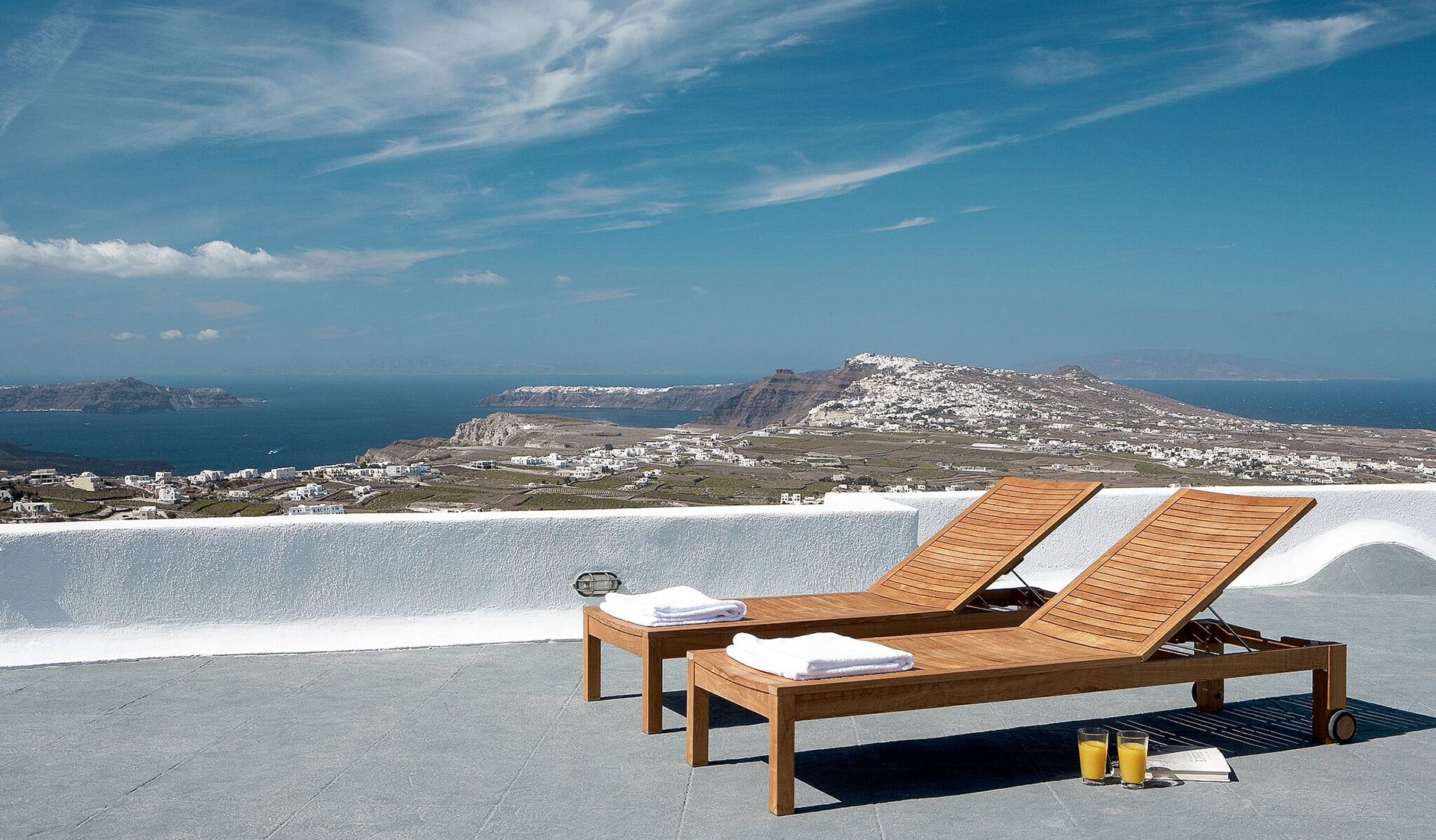 Two impressive pool terraces and various additional alfresco arrangements at Villa Fabrica offer plenty of space to lap up the brilliant Greek sunshine. The two pools and terraces offer wonderful views of the caldera and the entire island—benefitting from the high-ground location just underneath the historically important Castle of Pyrgos.